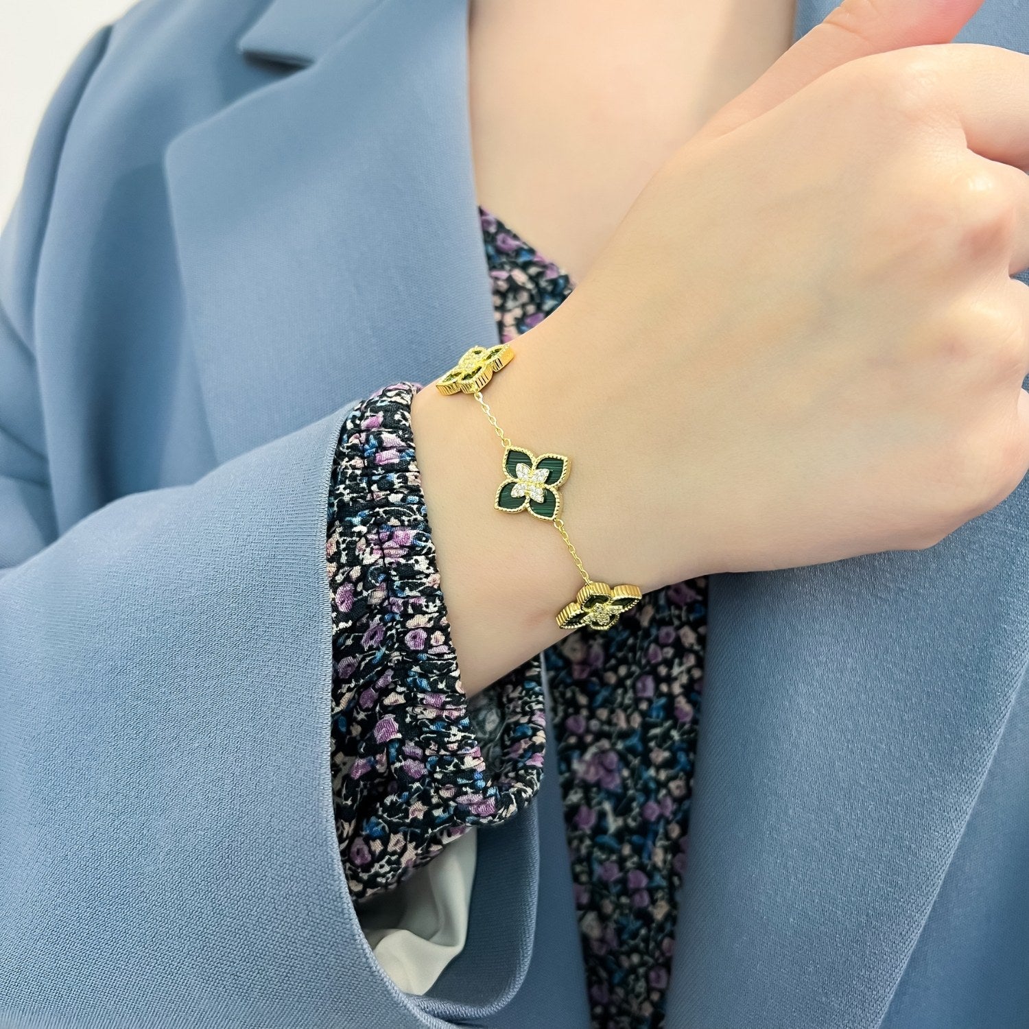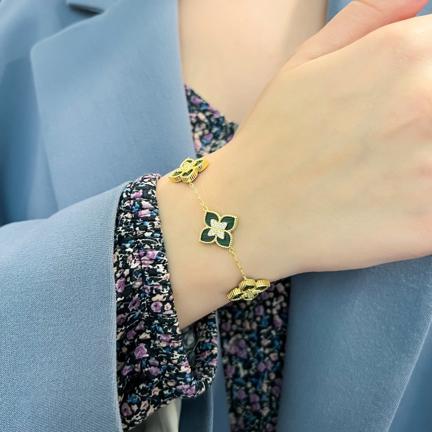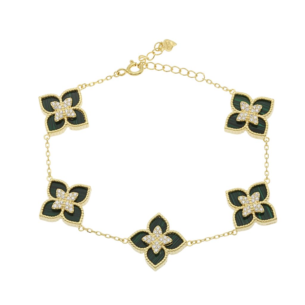 Adaugă un strop de rafinament și prospețime look-ului tău cu această brățară din argint 925 placat cu aur, decorată cu flori delicate și malachit natural. Cunoscut pentru nuanțele sale vibrante de verde, malachitul simbolizează echilibrul și armonia, completând perfect strălucirea aurului. Designul floral sofisticat face din această brățară un accesoriu feminin, elegant și atemporal, ideal pentru orice ocazie sau un cadou deosebit pentru cineva drag.
