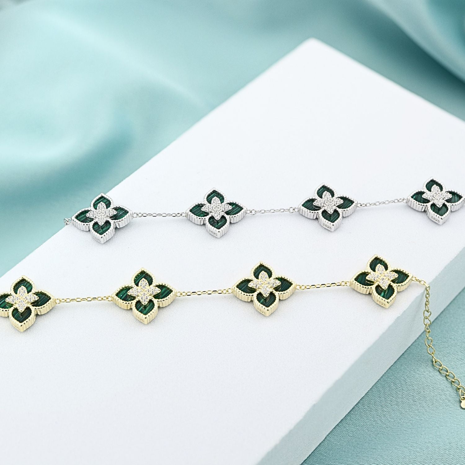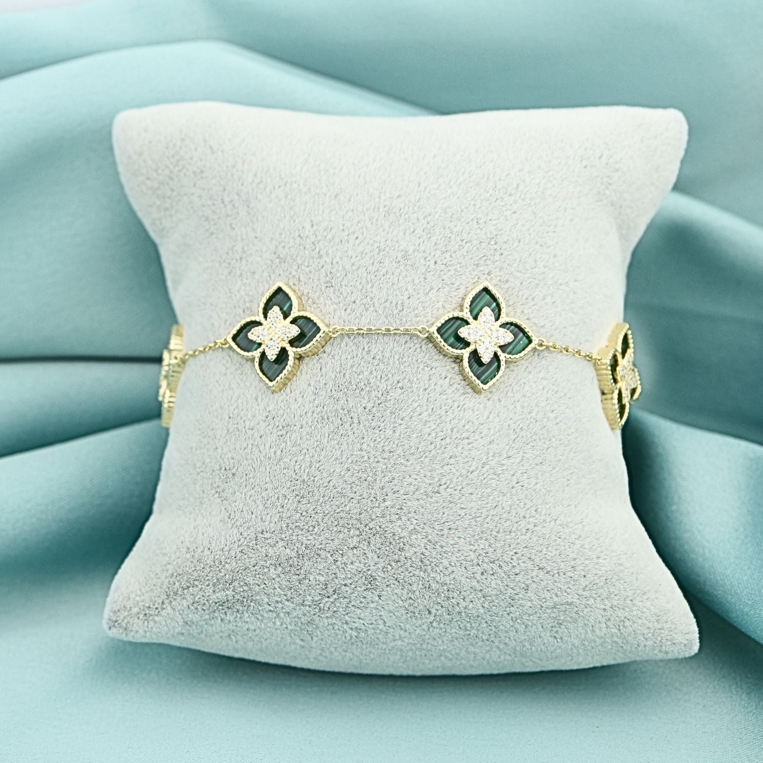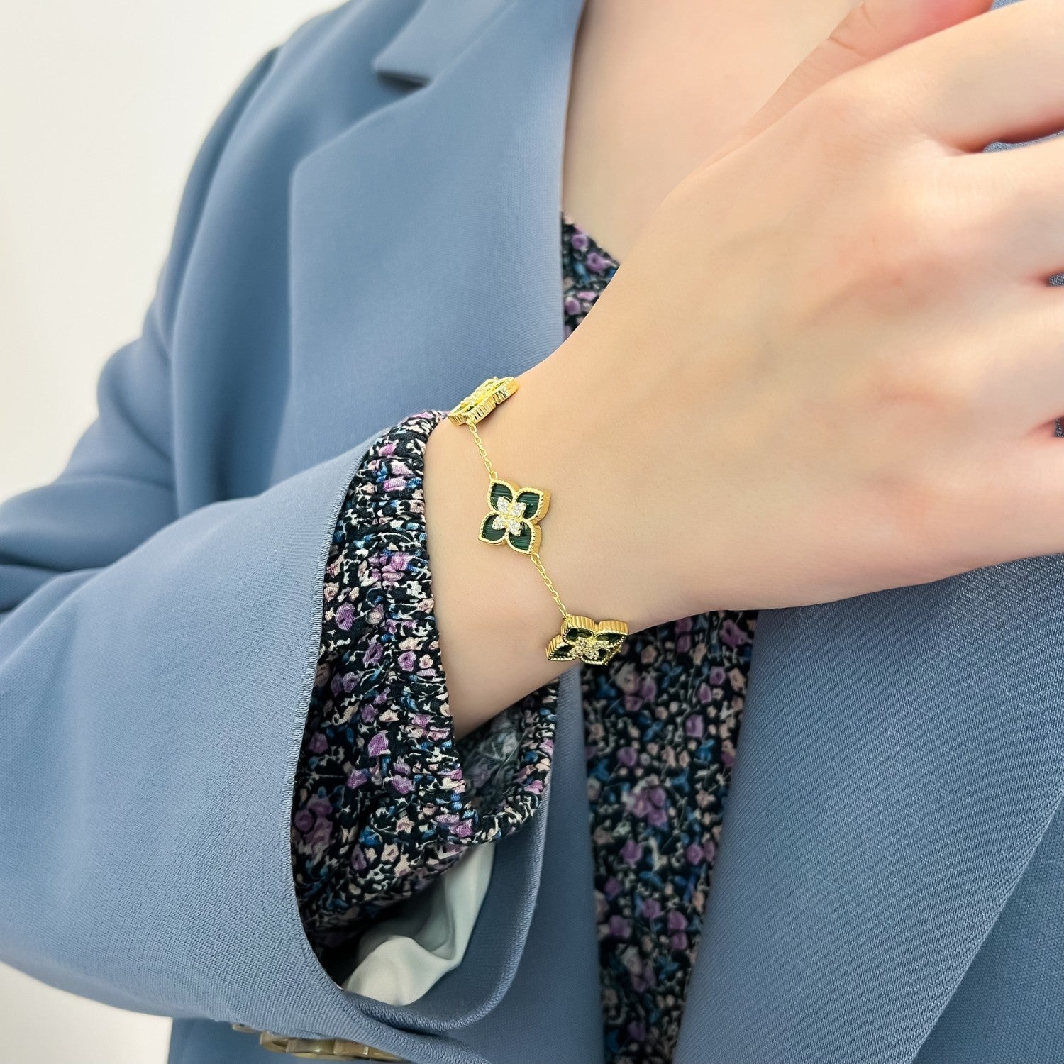 Adaugă un strop de rafinament și prospețime look-ului tău cu această brățară din argint 925 placat cu aur, decorată cu flori delicate și malachit natural. Cunoscut pentru nuanțele sale vibrante de verde, malachitul simbolizează echilibrul și armonia, completând perfect strălucirea aurului. Designul floral sofisticat face din această brățară un accesoriu feminin, elegant și atemporal, ideal pentru orice ocazie sau un cadou deosebit pentru cineva drag.