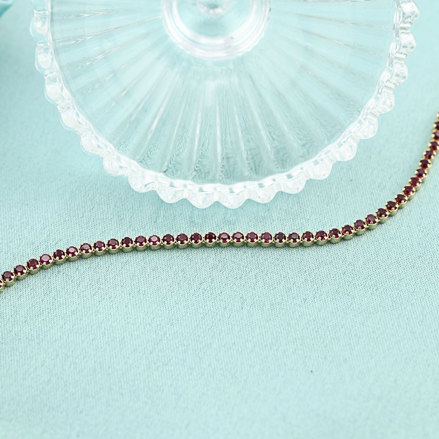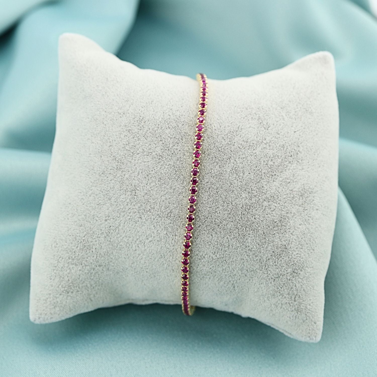 Bratara tennis din argint 925 placat cu aur, decorata cu pietre rubinii intense – un accesoriu de lux ce aduce eleganta si pasiune oricarei tinute.