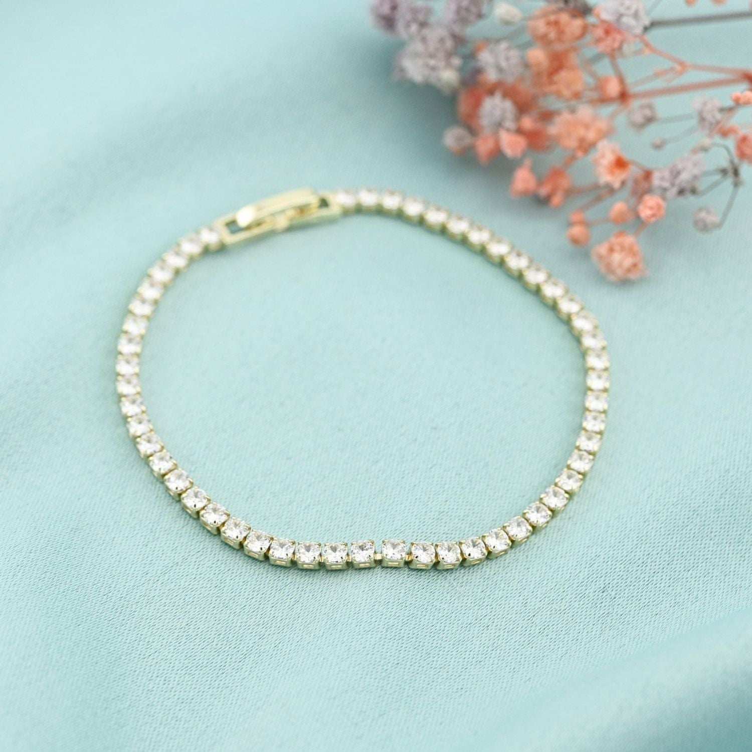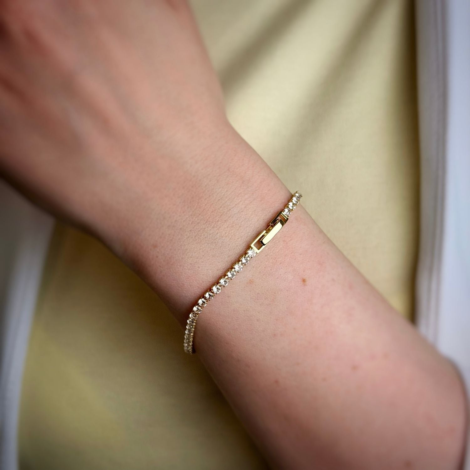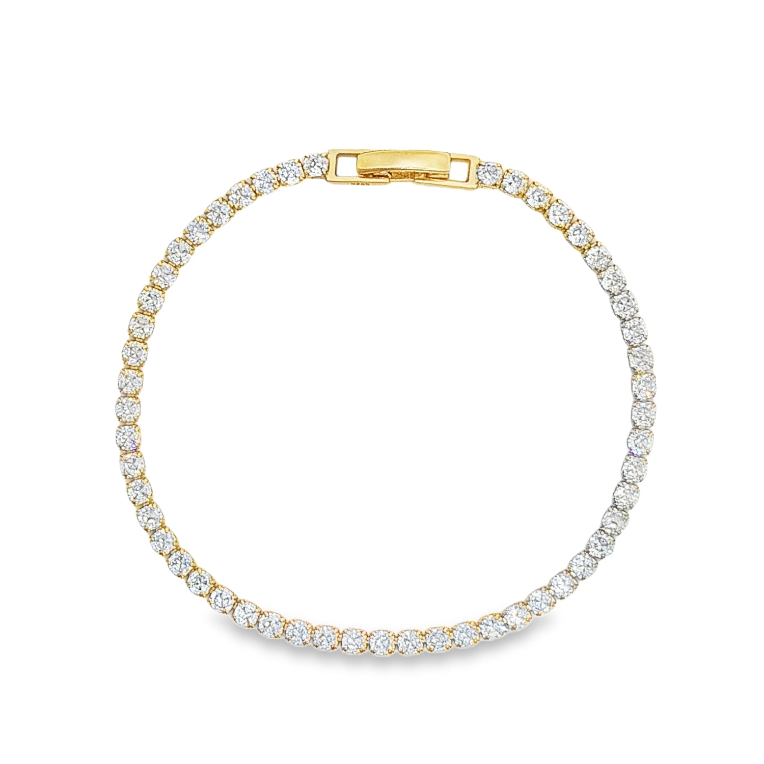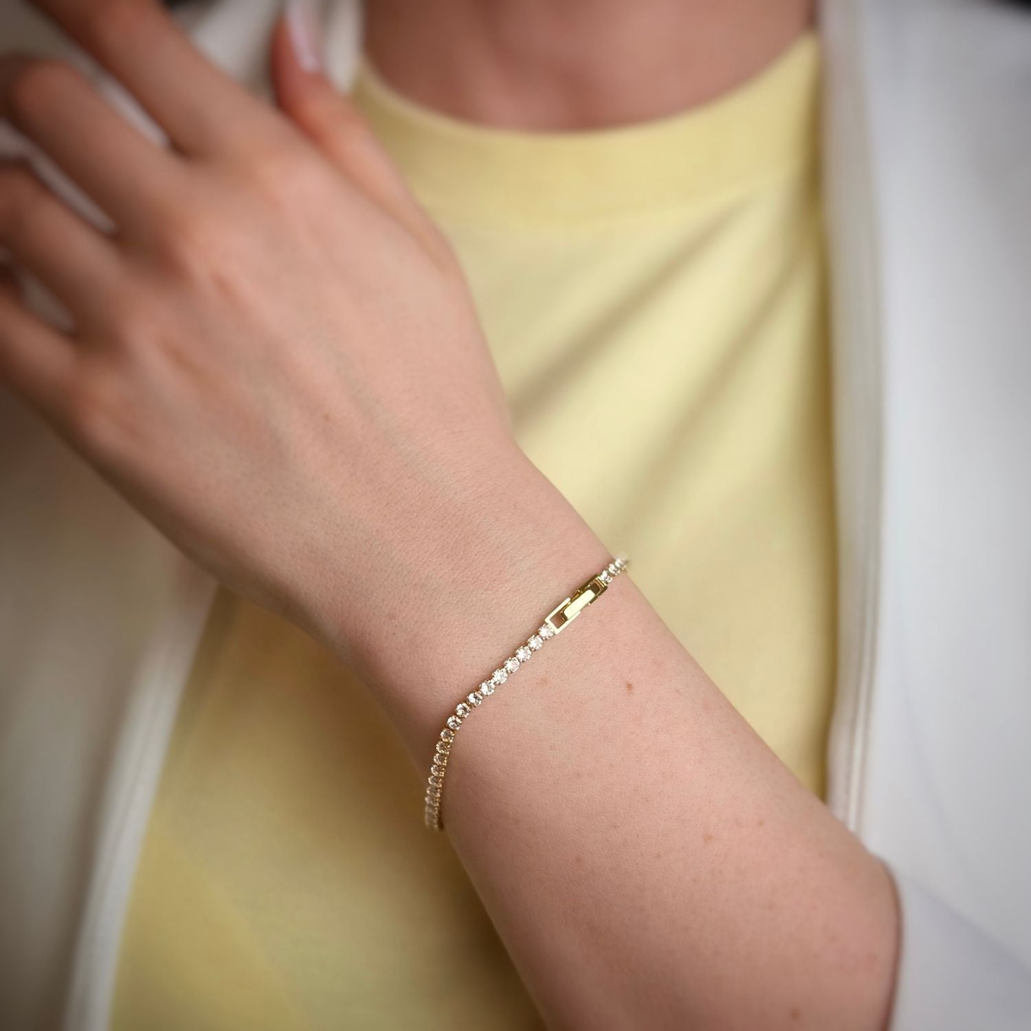 Bratara din argint placata cu aur tip tennis, eleganta si stralucitoare, ideala pentru un look sofisticat. Realizata din materiale de calitate premium, ofera durabilitate si finisaje impecabile. Perfecta pentru ocazii speciale sau cadou rafinat.