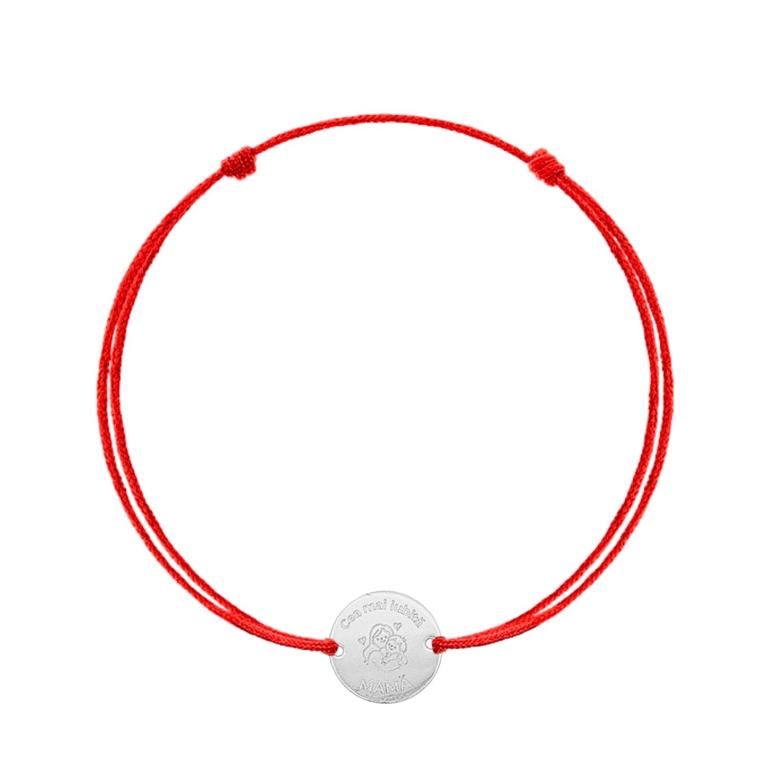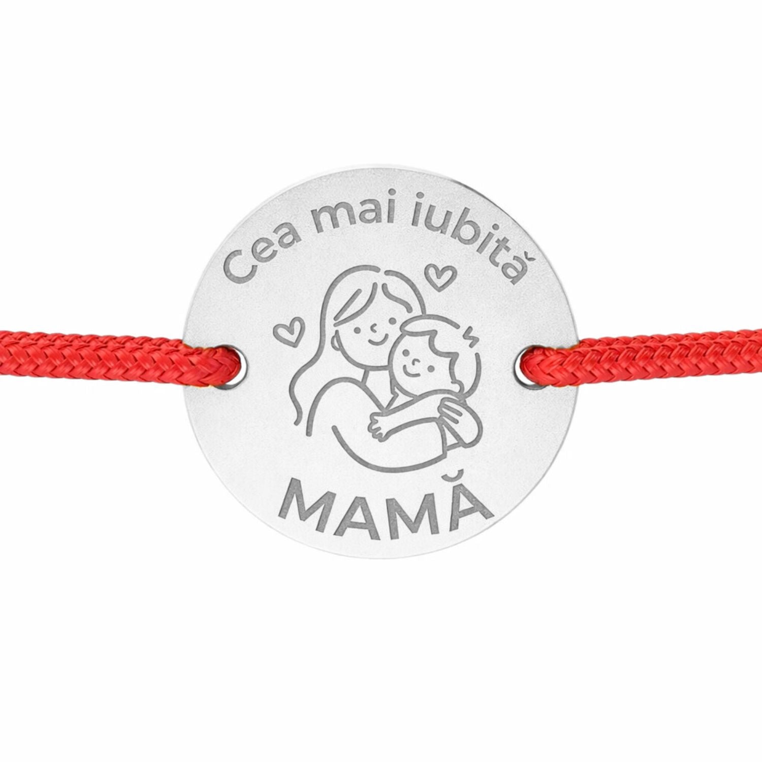 Bratara din argint cu snur si banut Mama este un accesoriu delicat cu o puternica incarcatura emotionala. Banutul gravat cu mesajul „cea mai iubita mama” exprima iubire si recunostinta, fiind ideal pentru a oferi un cadou special. Snurul reglabil asigura confort la purtare si o potrivire perfecta.