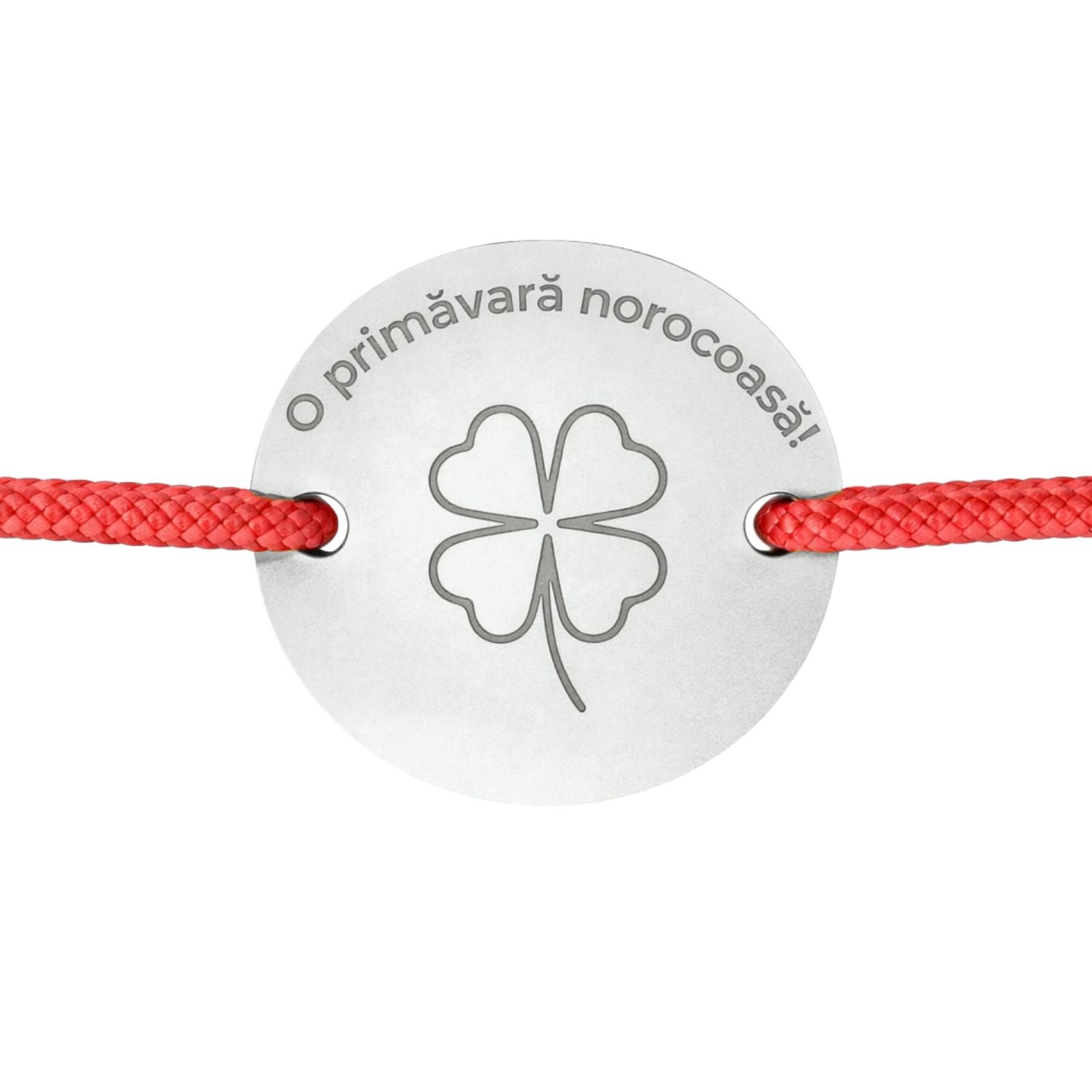 Bratara din argint cu snur si banut Trifoi este un accesoriu delicat cu simbolistica norocului si a primaverii. Banutul gravat cu mesajul „O primavara norocoasa!” transmite ganduri pozitive si energie buna. Snurul reglabil asigura confort la purtare, fiind potrivita pentru orice stil.