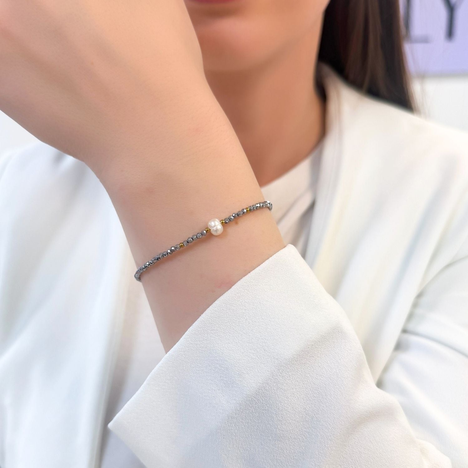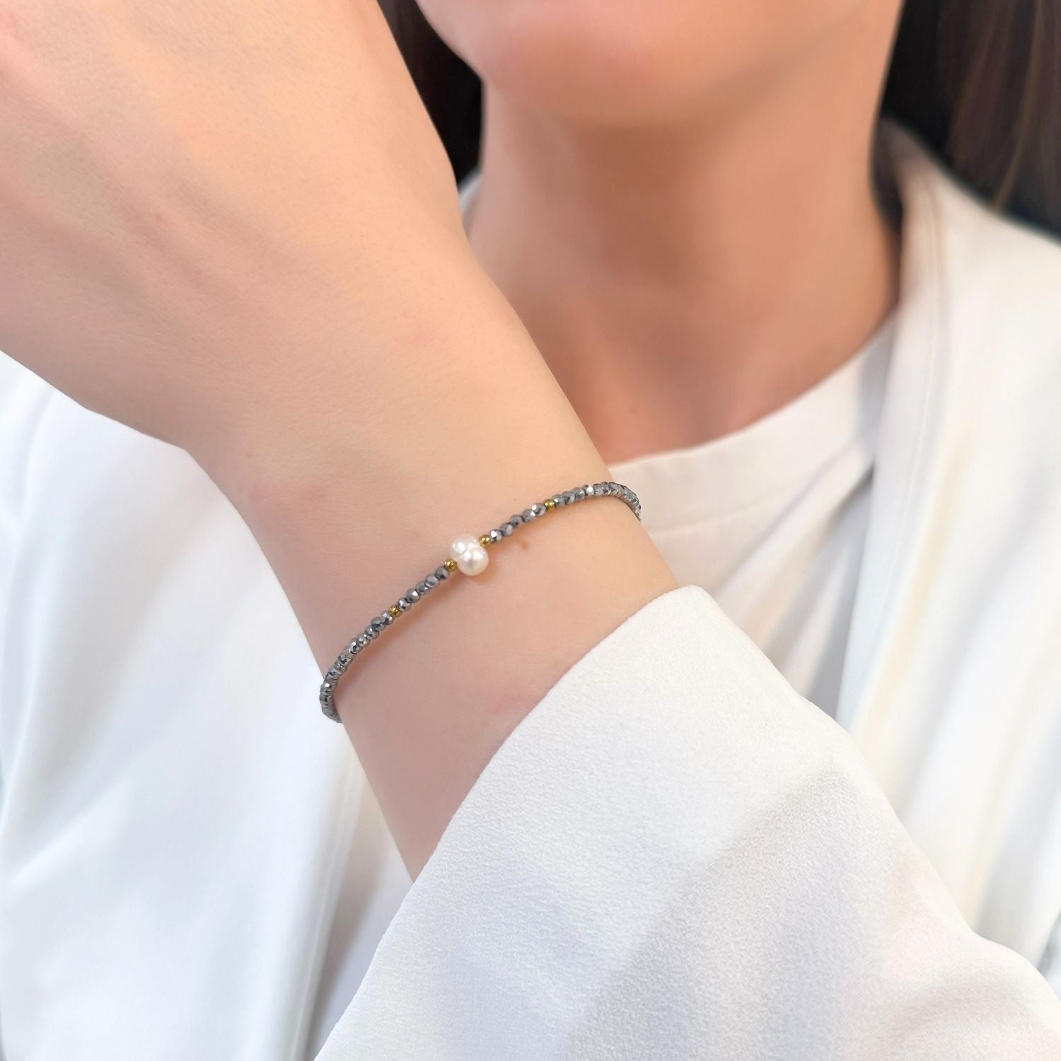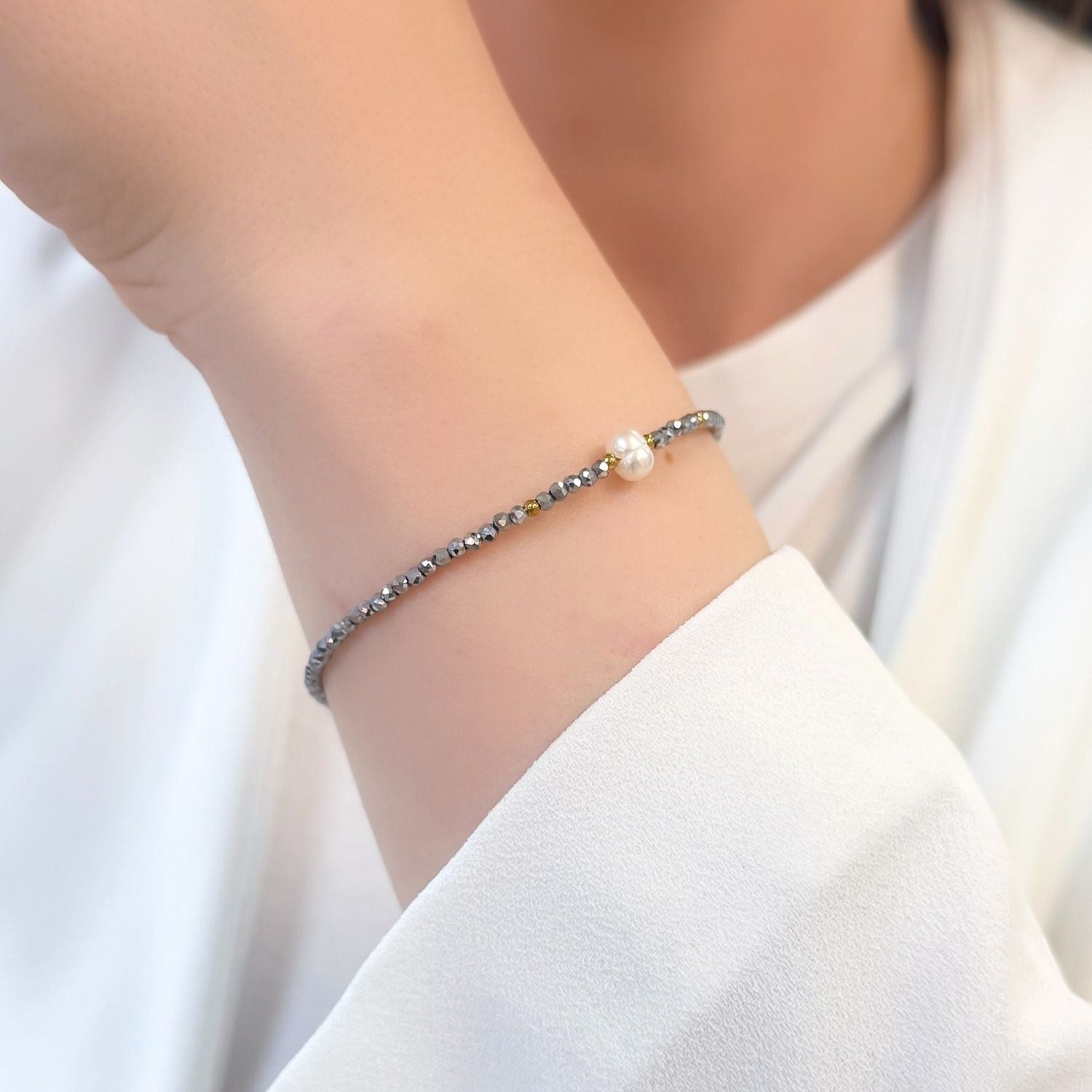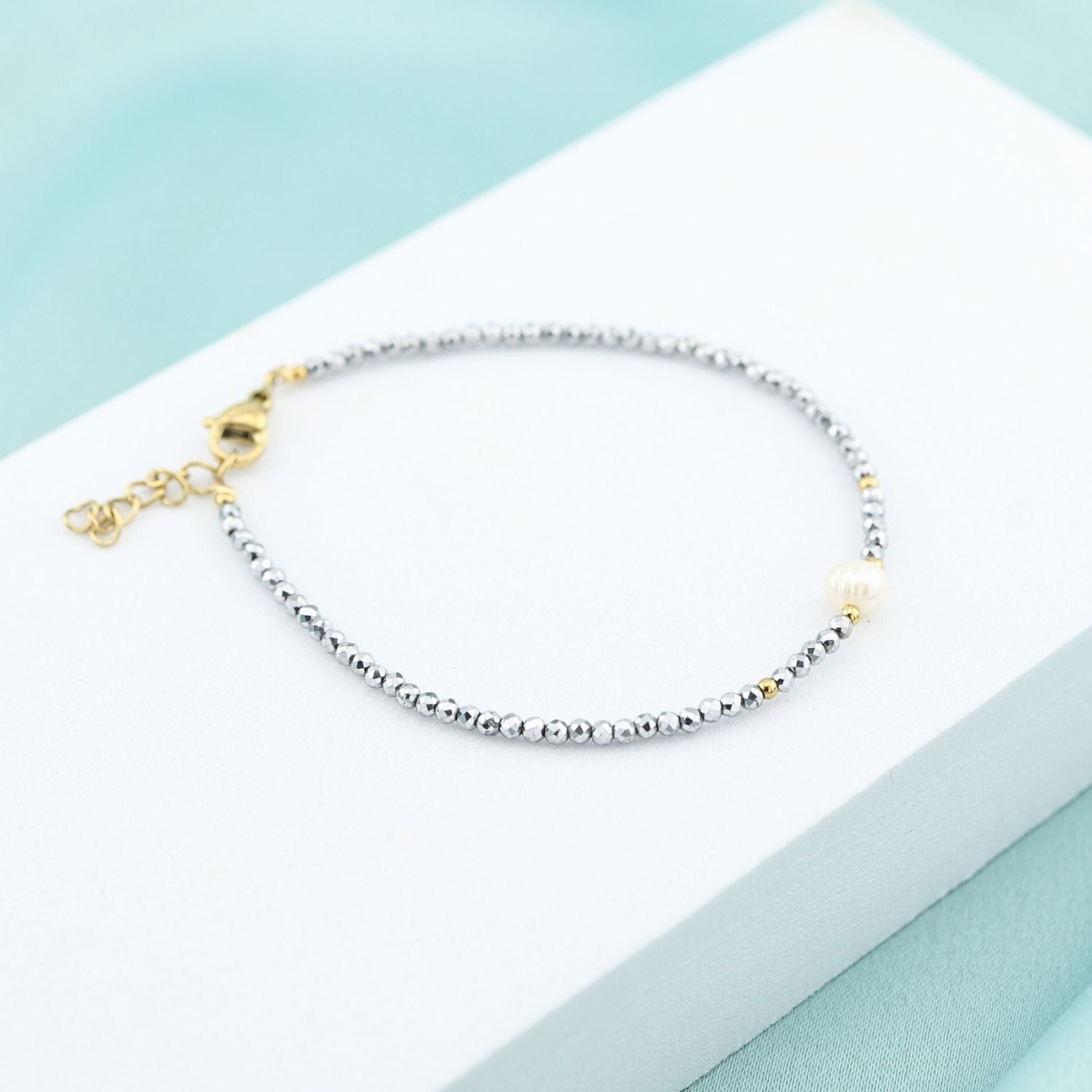 Bratara cu Bile de Hematit si Perla de Cultura este o bijuterie rafinata ce imbina eleganta clasica cu energie moderna. Realizata din bile de hematit, cunoscute pentru proprietatile lor protectoare si echilibrante, si o perla de cultura asezata central, simbol al puritatii si feminitatii, bratara transmite armonie si rafinament.
