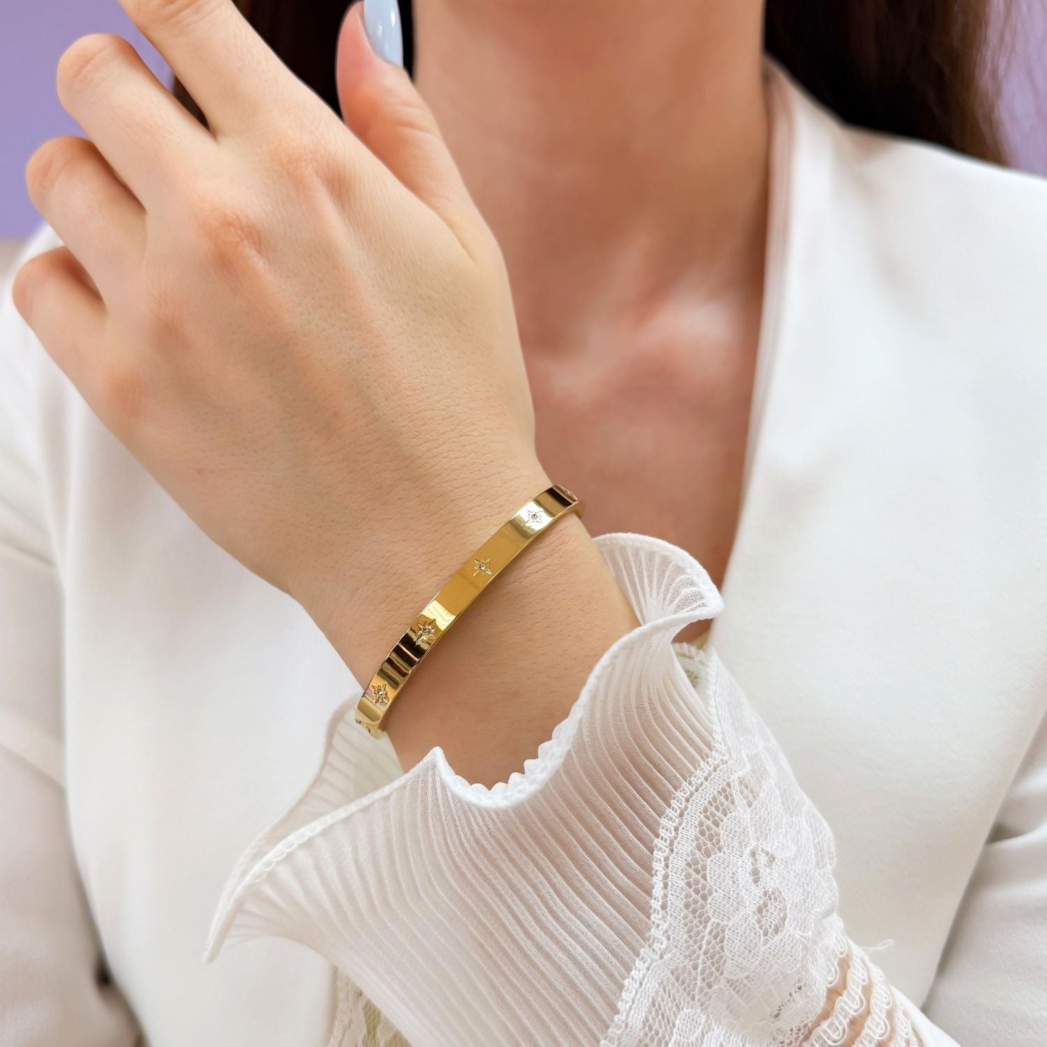 Bratara fixa Northstar Bangle din otel chirurgical inoxidabil placata cu aur este o bijuterie moderna si plina de simbolism. Decorata cu steaua nordului, simbol al ghidarii, sperantei si protectiei, aceasta bratara adauga un strop de magie oricarei tinute. Designul minimalist o face versatila si usor de purtat atat zilnic, cat si la ocazii speciale.