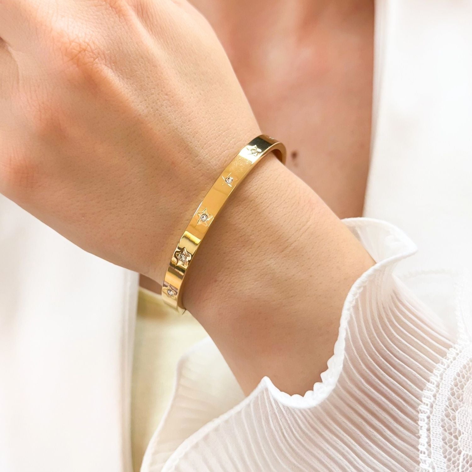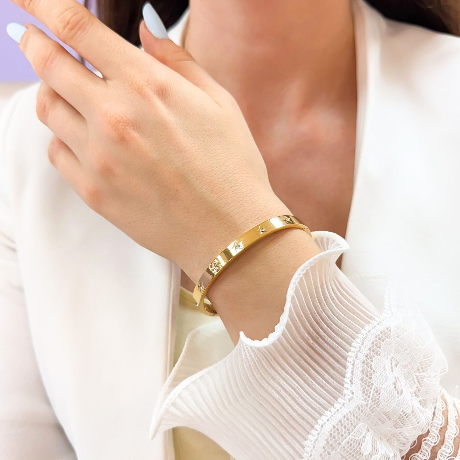Bratara fixa Star Bangle din otel chirurgical inoxidabil placata cu aur este o piesa delicata si feminina, decorata cu stelute subtile care aduc un plus de stralucire. Designul minimalist si elegant o face usor de purtat zilnic, dar si la evenimente speciale, ca accesoriu chic.