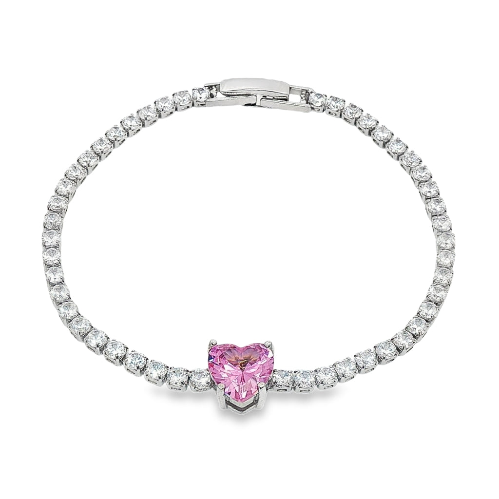 Bratara Tennis cu pandantiv inima roz, placata cu aur – accesoriu delicat și romantic, perfect pentru tinute elegante sau cadouri speciale.