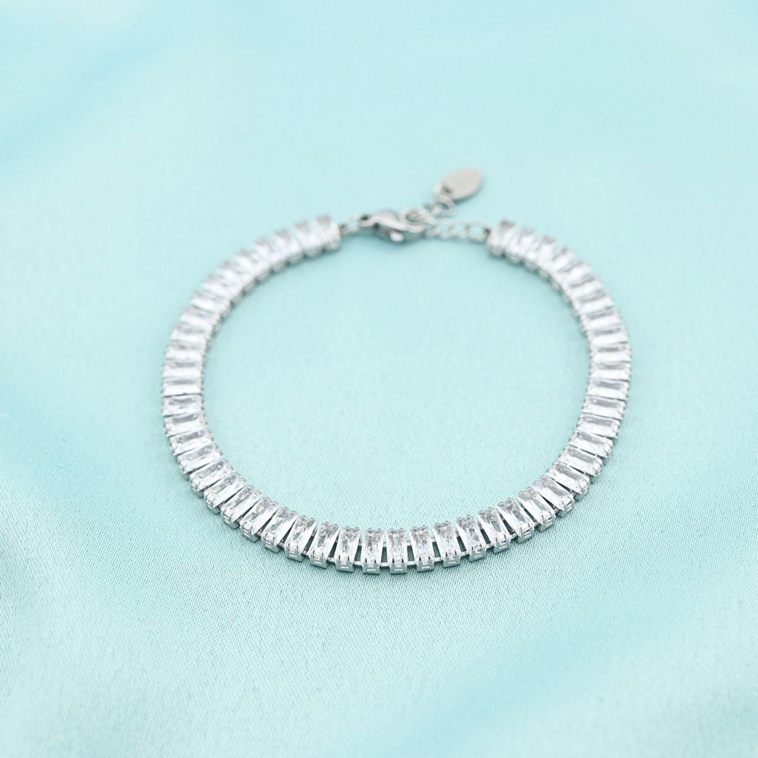 Bratara Tennis decorata cu pietre zirconia albe stralucitoare, dreptunghiulare. Bijuterie clasica, eleganta si perfecta pentru orice ocazie.