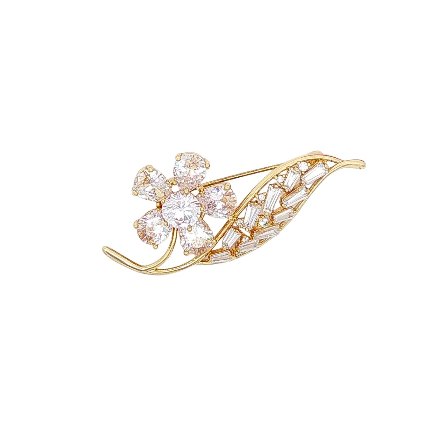 Brosa placata cu aur 14k Floare cu Pietre Albe este un accesoriu elegant inspirat din frumusetea naturii. Designul delicat al florii este accentuat de pietre stralucitoare, oferind un plus de rafinament si feminitate. Placarea cu aur 14k asigura stralucire de durata si un aspect premium.