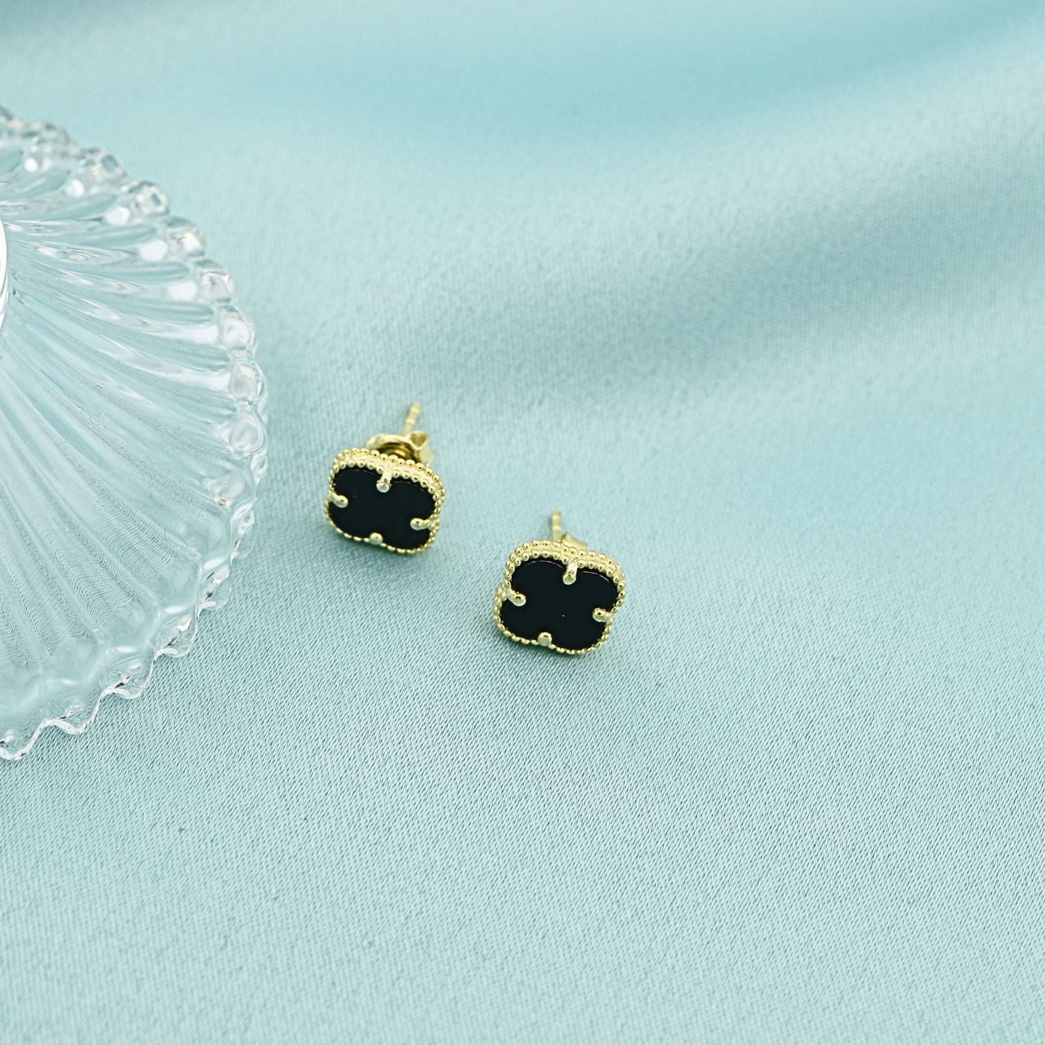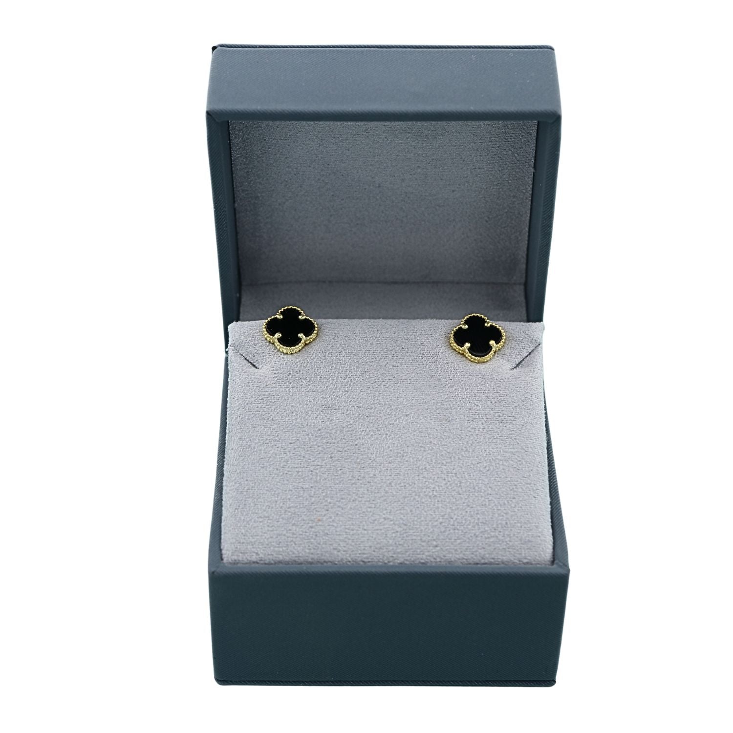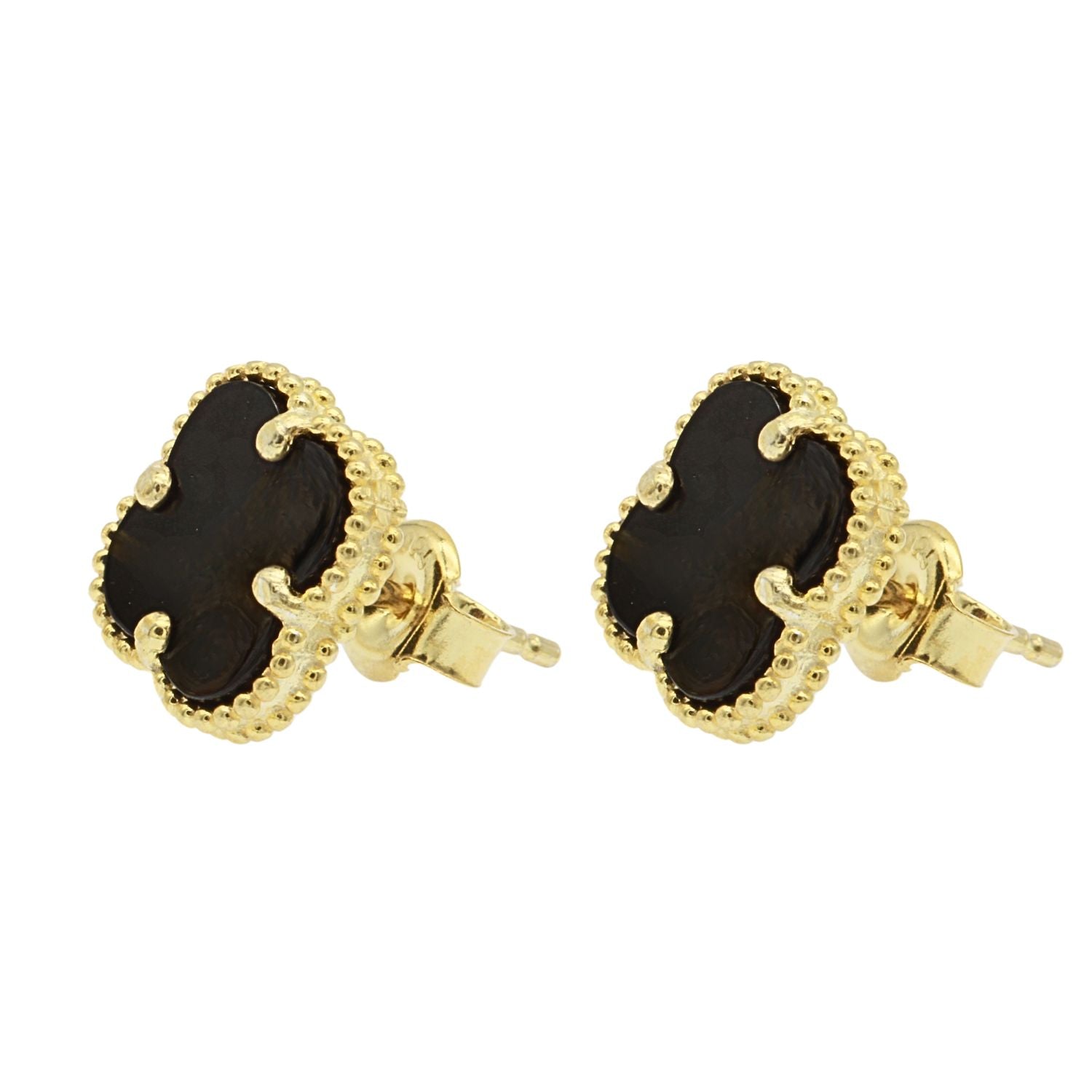 Cercei din argint 925 placat cu aur de 18k, model floare cu onix natural. Un accesoriu elegant si misterios, perfect pentru un look sofisticat.