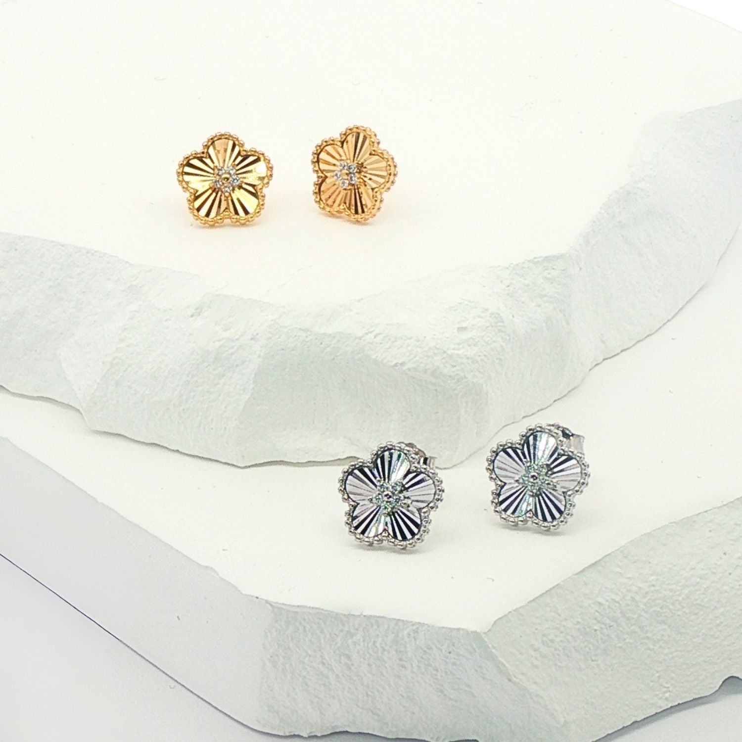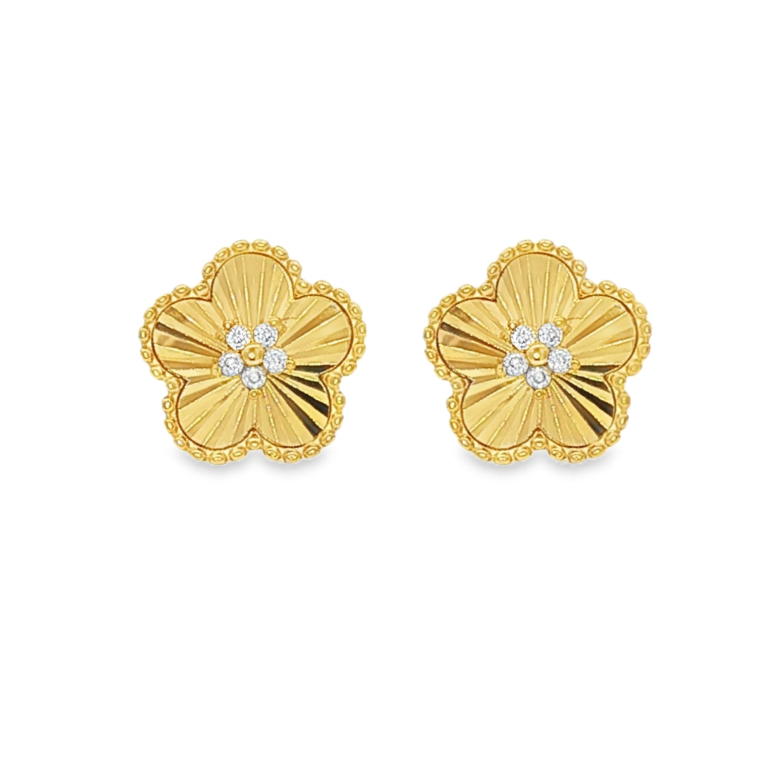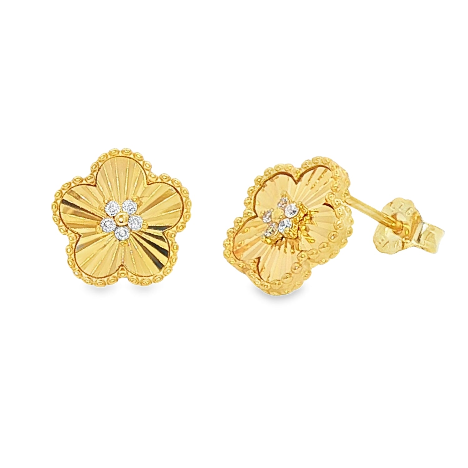 Cercei din argint placati cu aur in forma de floare cu striatii si pietre zirconia, eleganti si rafinati. Realizati din materiale de calitate premium, ofera stralucire si durabilitate. Perfecti pentru tinute sofisticate sau ocazii speciale.
