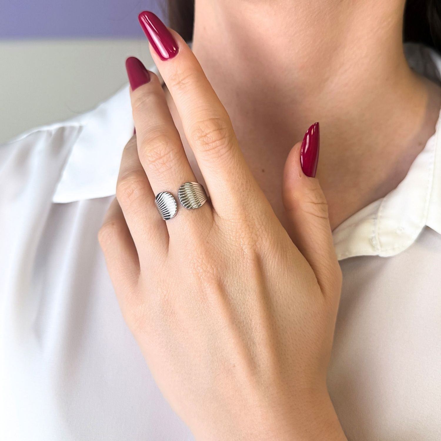 Inel din argint cu model rizat, in forma de scoica, modern si stilat.