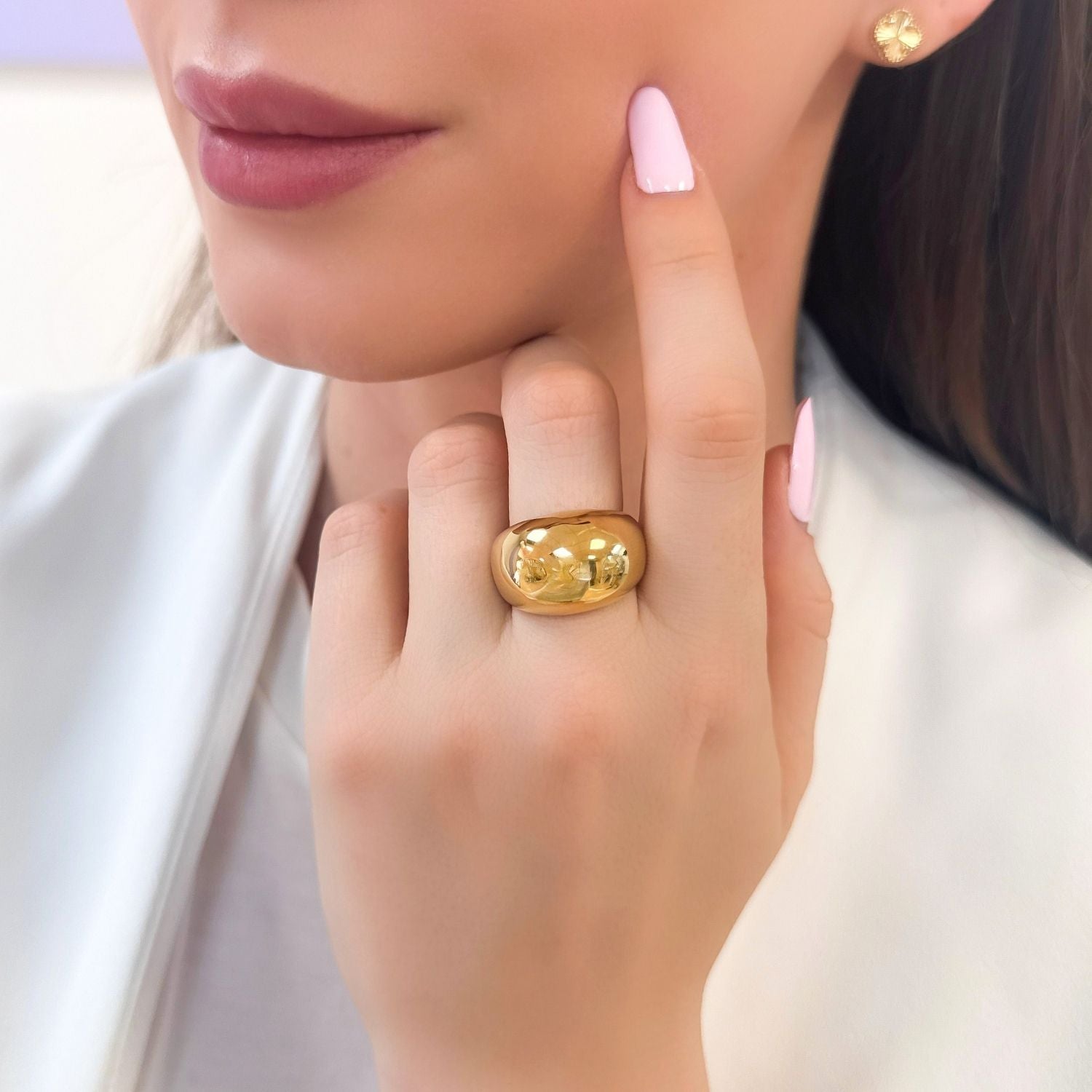 Inel placat cu aur 14k, cu design bold – o bijuterie statement, modernă și elegantă, perfectă pentru un look îndrăzneț și sofisticat. Inelul este placat cu aur de 14k intr-un strat gros de cel putin 2 microni, fapt ce ii confera o rezistenta indelungata.