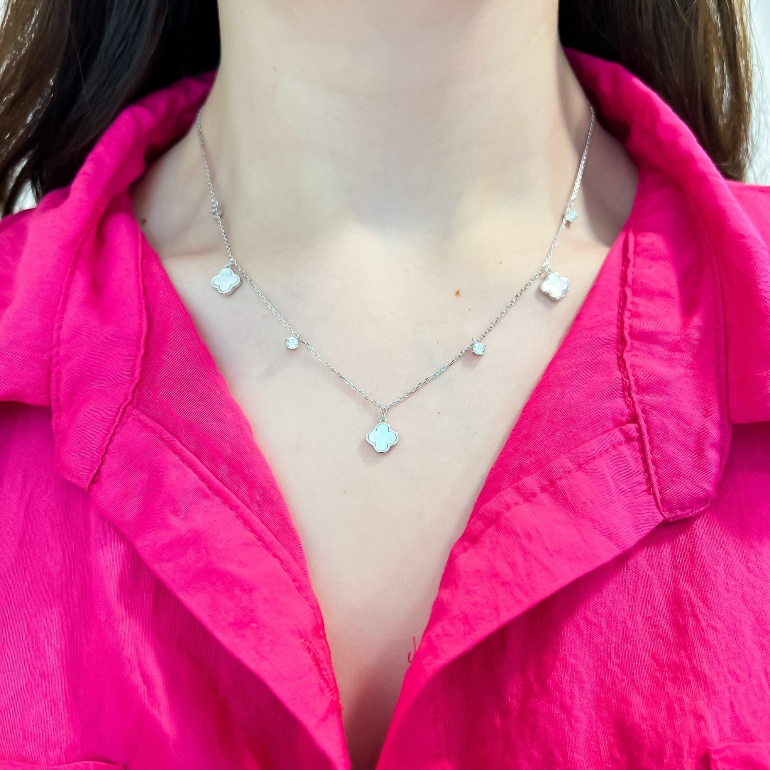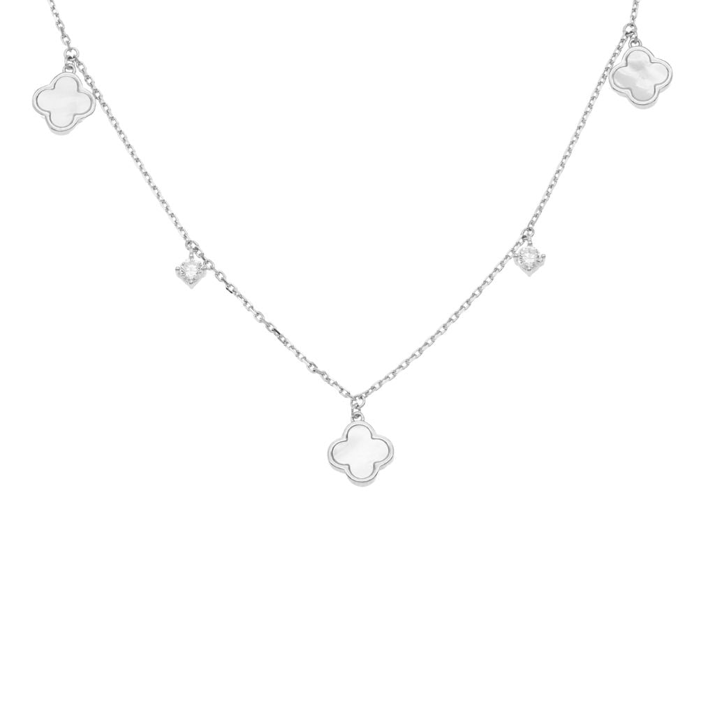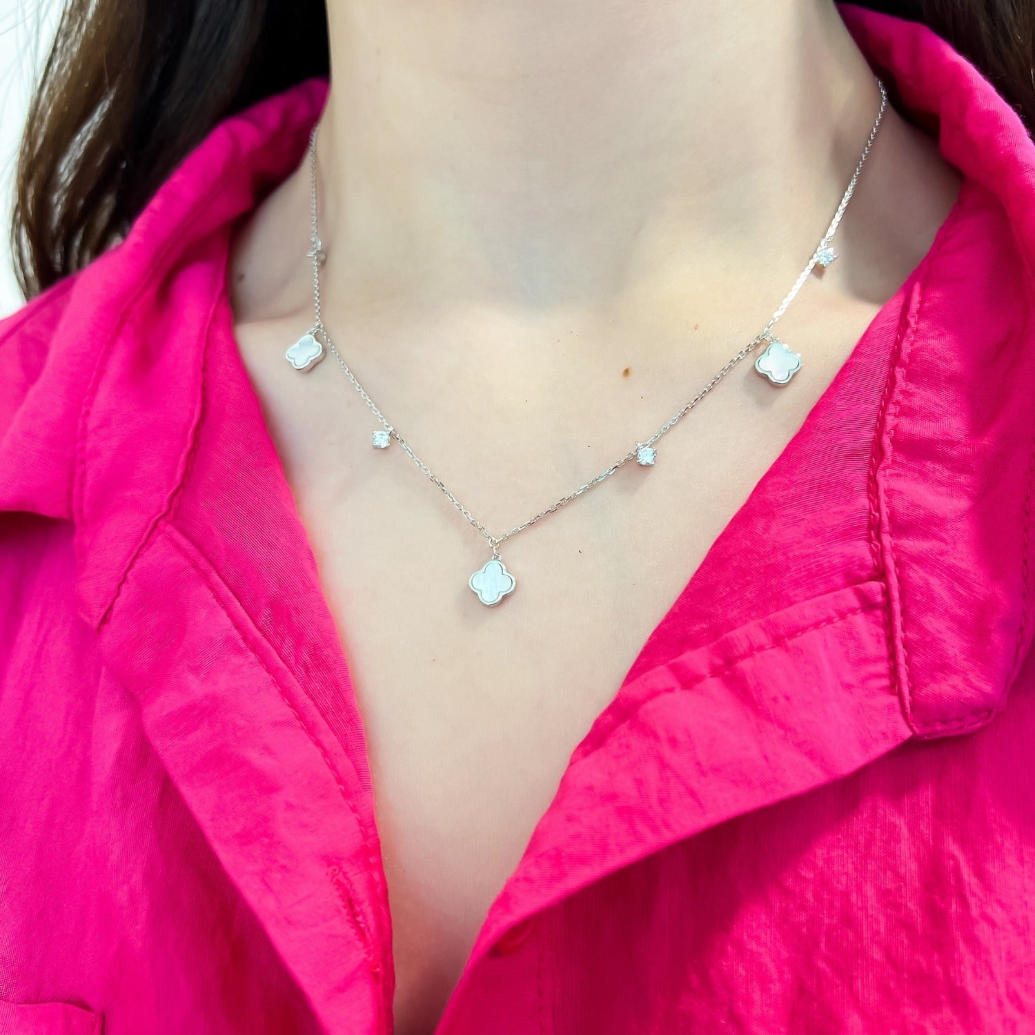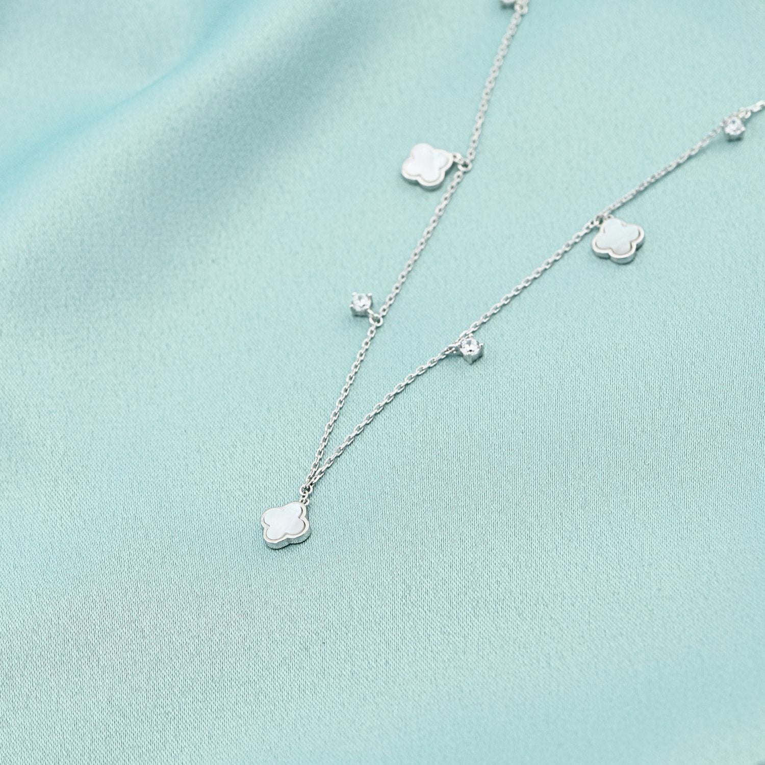Completează-ți stilul cu acest lănțișor fin și elegant, realizat din argint 925. Designul delicat îmbină armonios pandantivele din sidef în formă de flori cu strălucirea pietrelor din zirconiu cubic, creând un accesoriu sofisticat și feminin.