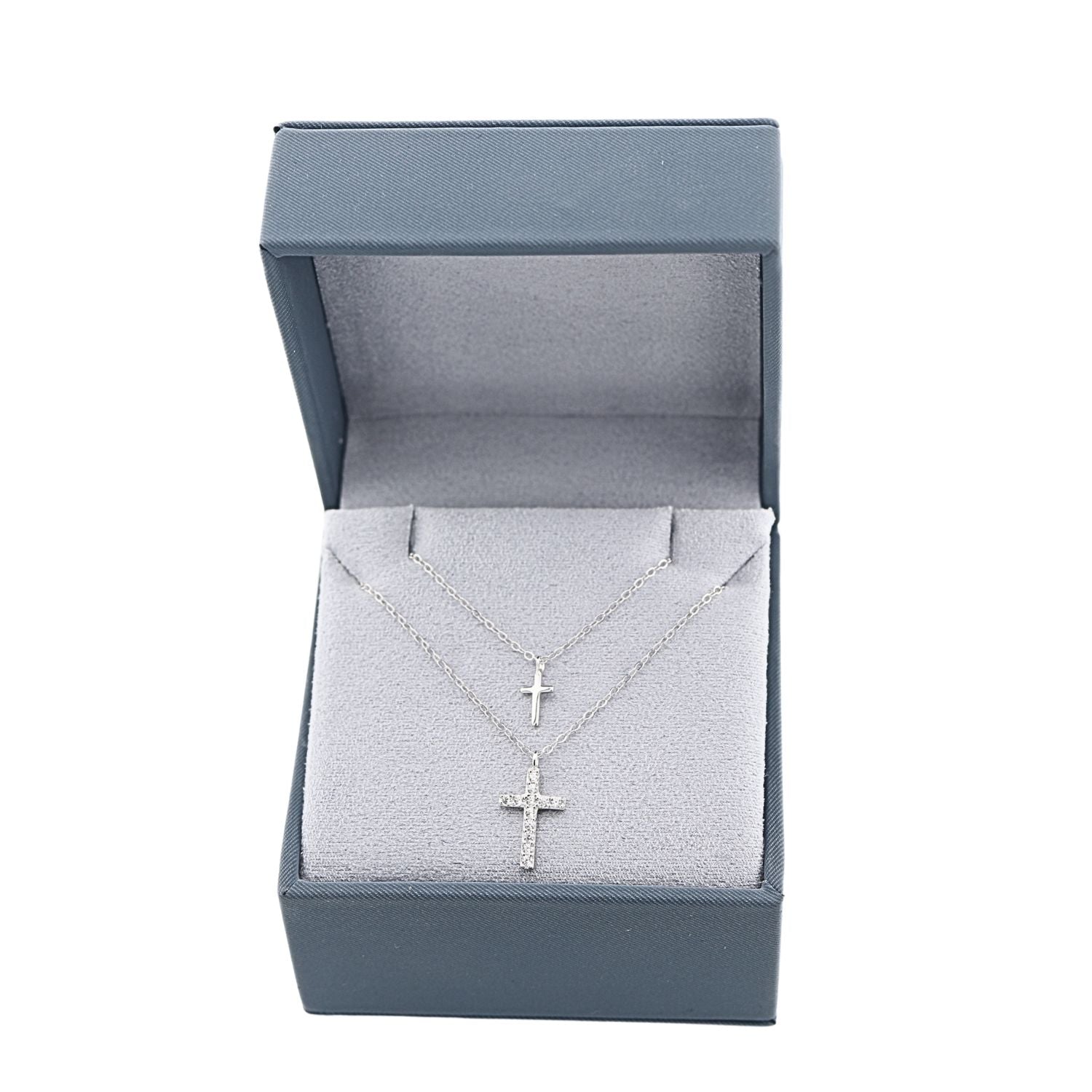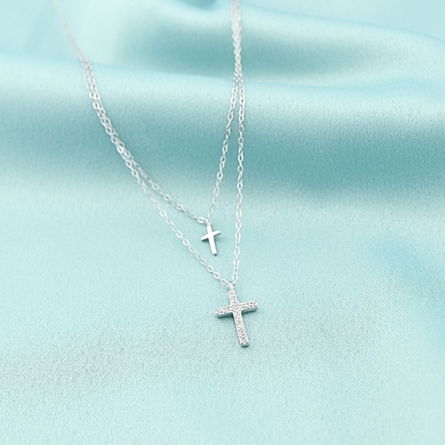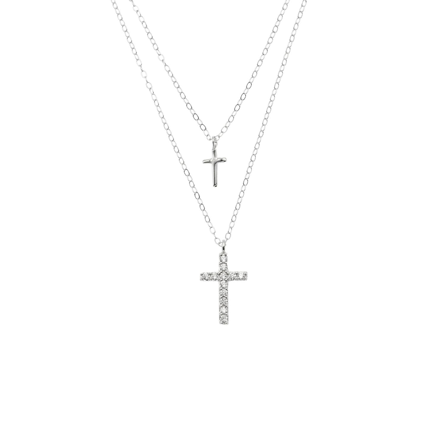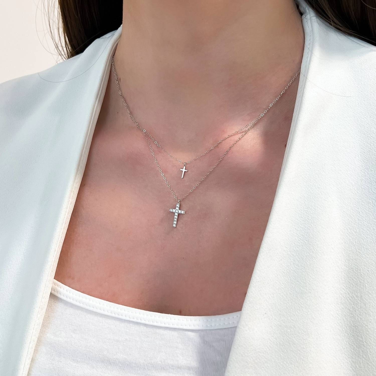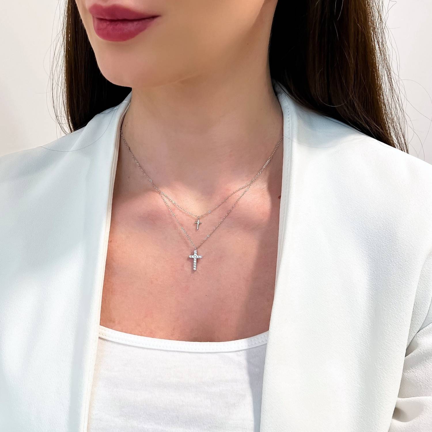 Lant dublu din argint cu pandantiv cruce decorata cu pietre albe stralucitoare. Un accesoriu elegant si simbolic, ideal pentru orice tinuta.