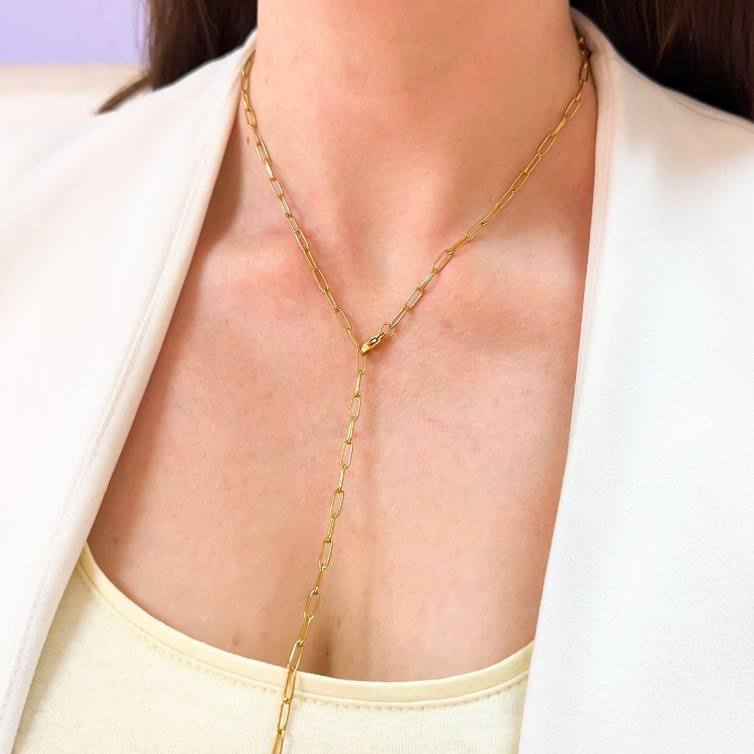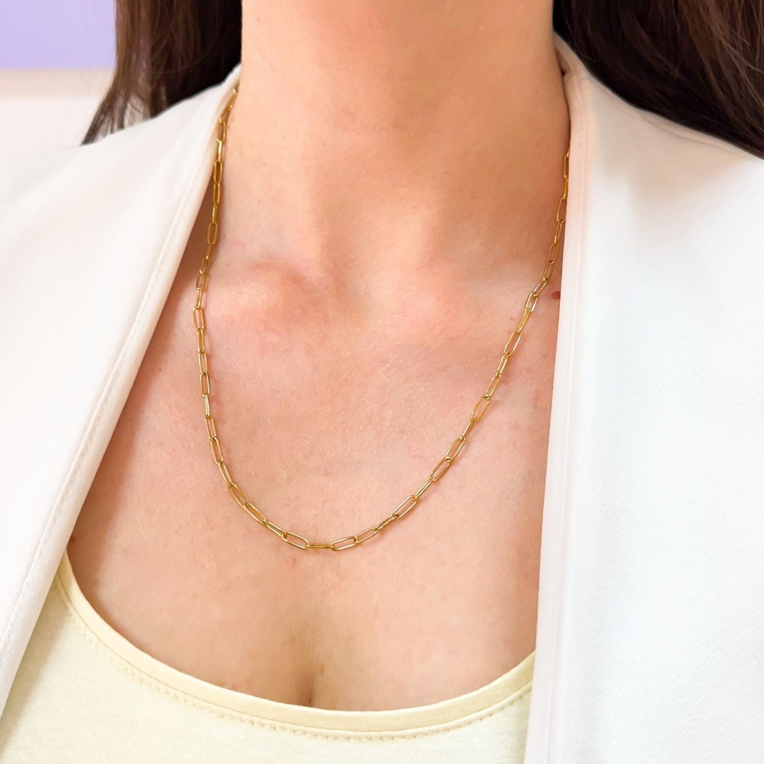 Lantul Paperclip din otel chirurgical inoxidabil placat cu aur este o piesa moderna si extrem de versatila. Designul sau cu zale alungite tip „paperclip” este minimalist si elegant, perfect atat pentru purtare zilnica, cat si pentru ocazii speciale.