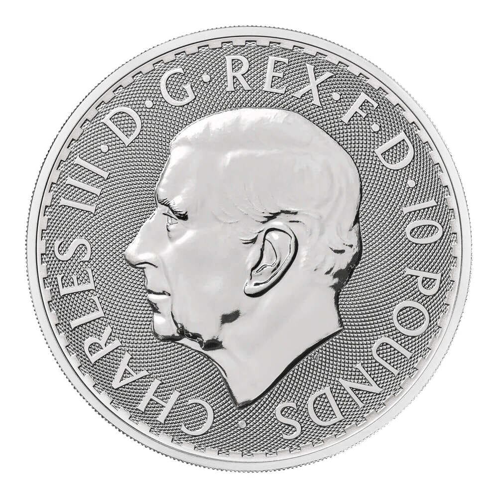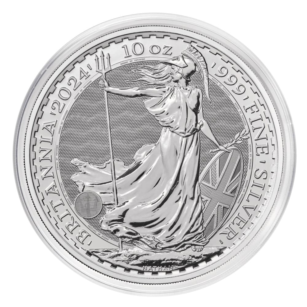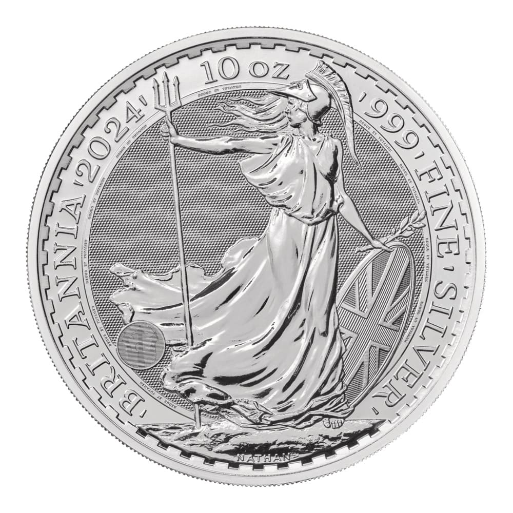 Numai Monetăria Regală este capabilă să bată monede Britannia autentice cu designul premiat al lui Philip Nathan, care este prezent pe monedele din 2024.