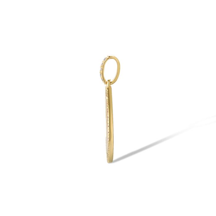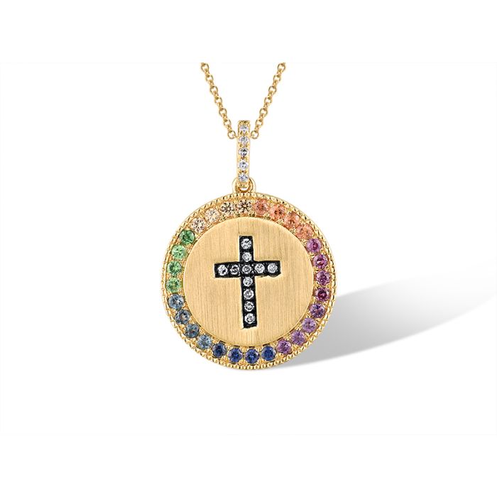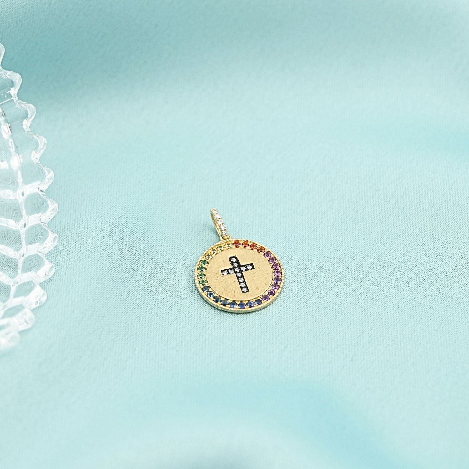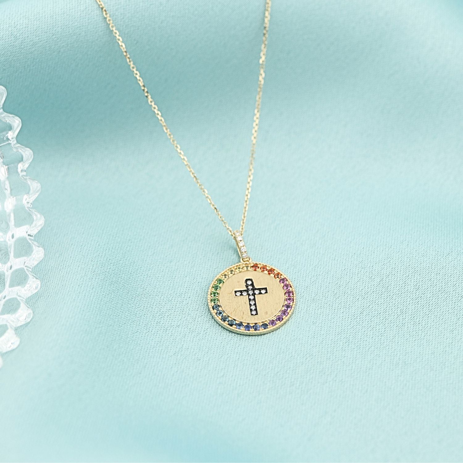 Acest pandantiv din aur de 14k în formă de bănuț, cu un design elegant al crucii, este perfect pentru iubitorii de bijuterii rafinate. Împodobit cu diamante de 0.045 ct și pietre prețioase, precum safire, ametiste și topaz, pandantivul adaugă o notă de culoare și strălucire oricărei ținute. Ideal pentru ocazii speciale sau cadou rafinat, acest accesoriu nu doar că emană eleganță, dar și valoare datorită pietrelor prețioase. Fiecare detaliu al pandantivului reflectă meșteșugul desăvârșit al bijutierilor, iar combinația dintre aurul de 14k și diamantele fine aduce o frumusețe de neegalat. Adaugă un strop de lux și rafinament garderobei tale cu acest pandantiv unicat!
