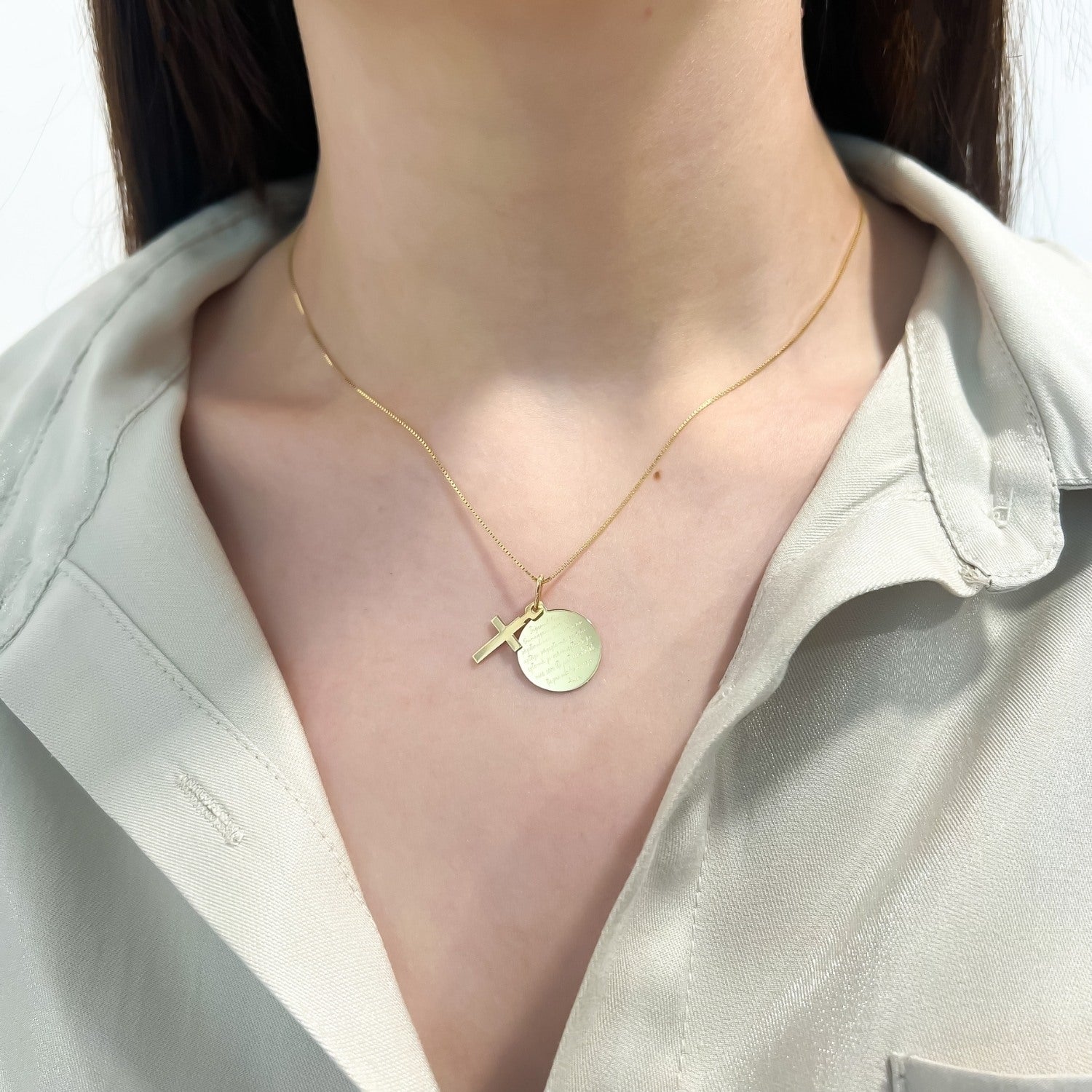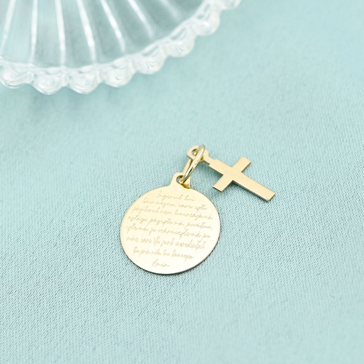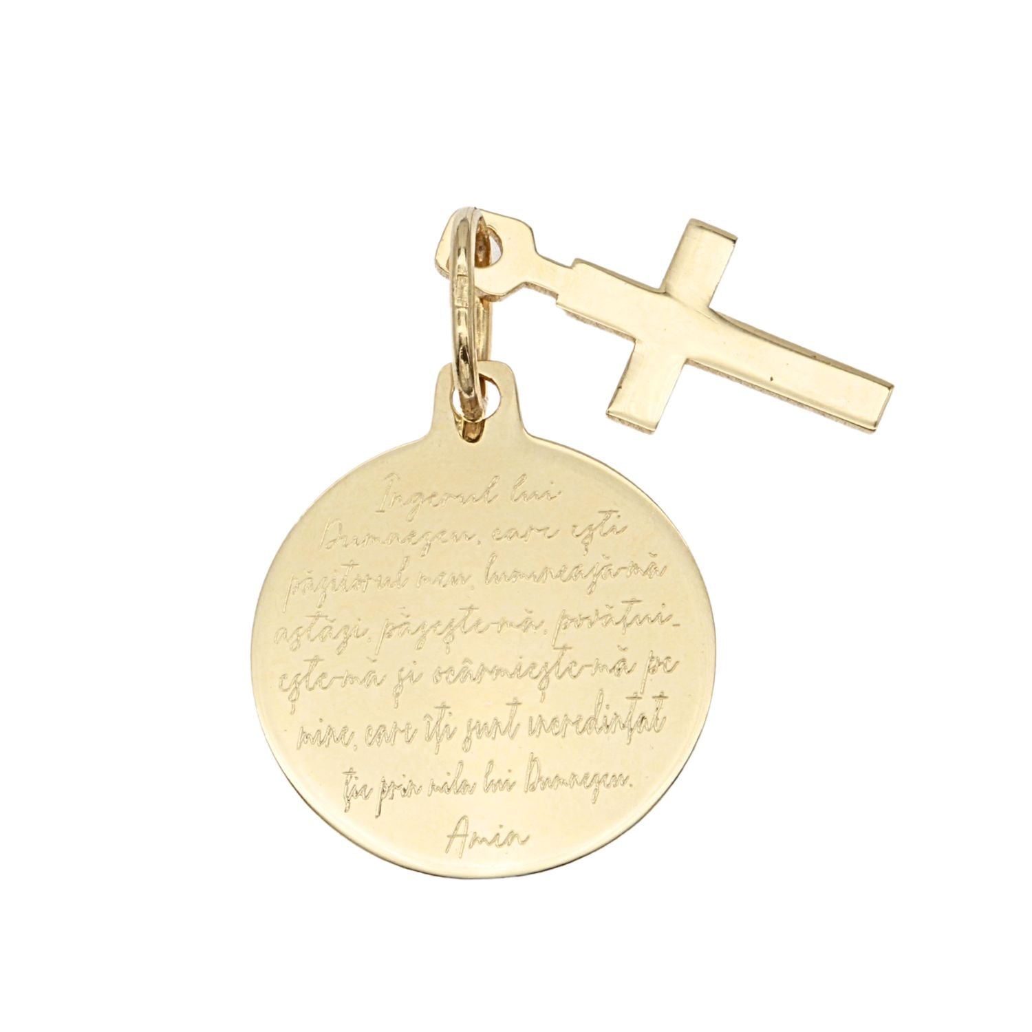 Pandantiv din aur galben de 14K, compus dintr-un bănuț elegant gravat cu o rugăciune de protecție și o cruce fin lucrată – un simbol puternic al credinței și al protecției divine. Pe bănuț este inscripționat mesajul: „Îngerul lui Dumnezeu, care ești păzitorul meu, luminează-mă astăzi, păzește-mă, povățuiește-mă și ocârmuiește-mă pe mine, care îți sunt încredințat ție prin mila lui Dumnezeu. Amin.” Această bijuterie cu semnificație profundă este un cadou perfect pentru botez, aniversări sau alte ocazii spirituale, oferind purtătorului un sentiment de liniște, iubire și ghidare divină. O piesă de suflet, cu valoare emoțională și spirituală aparte.