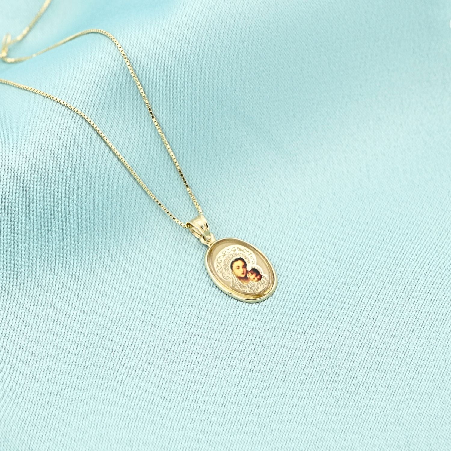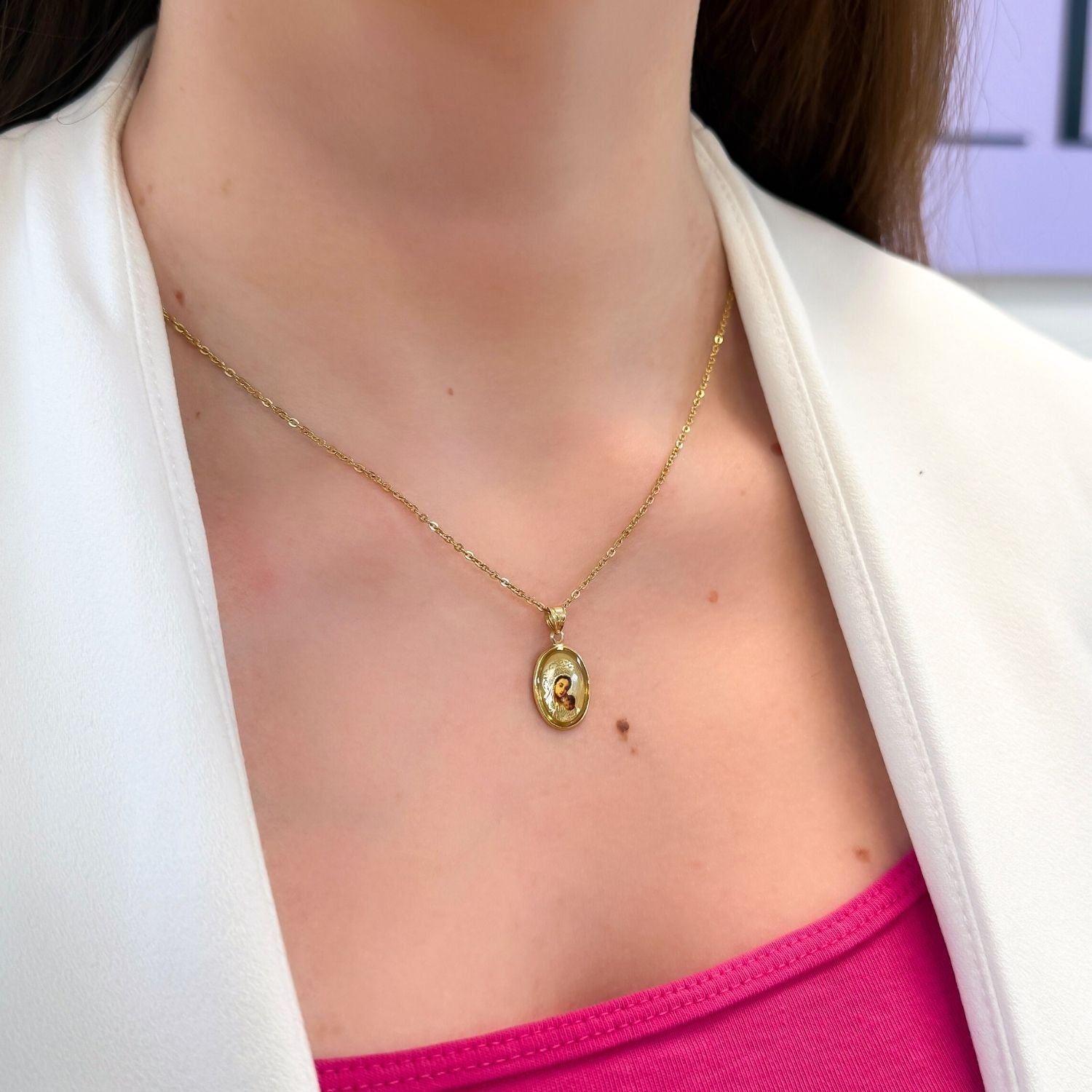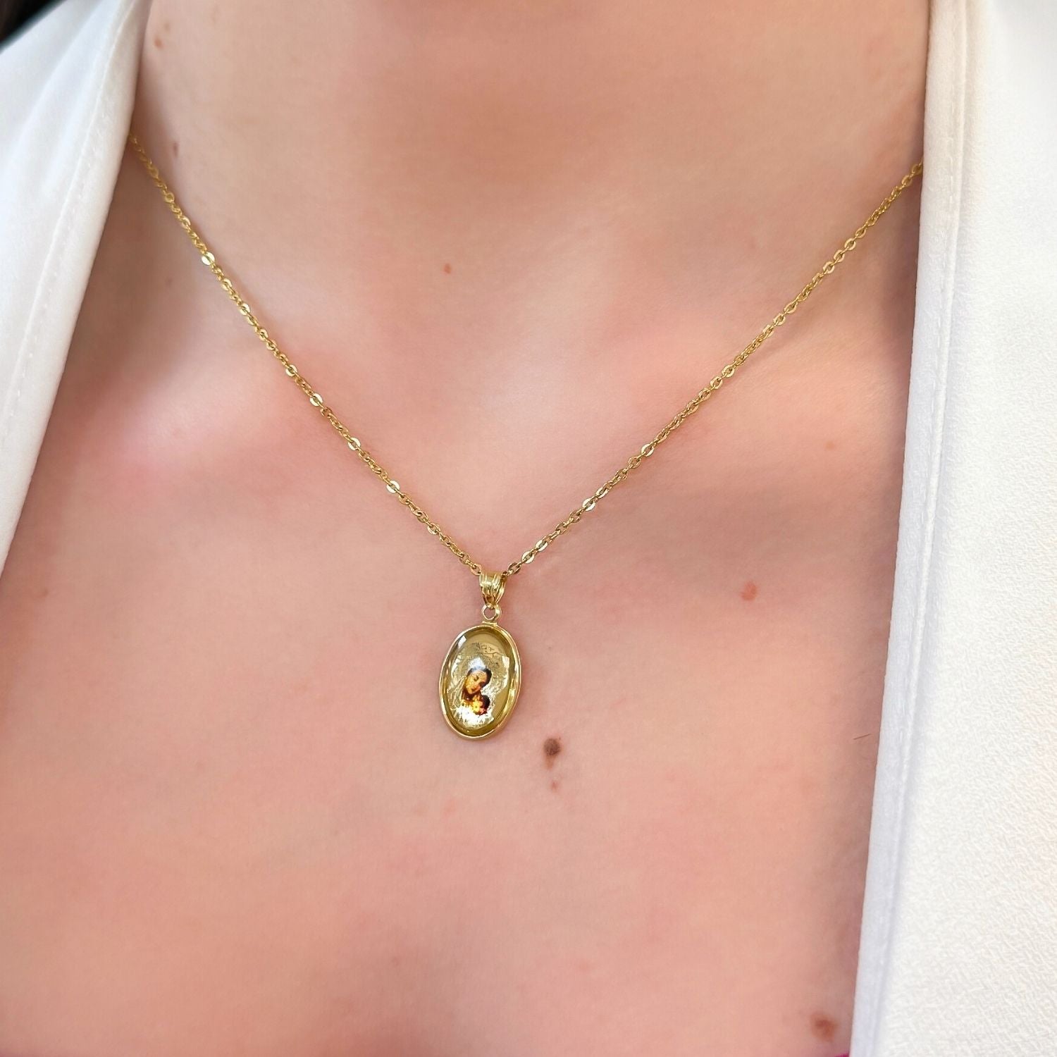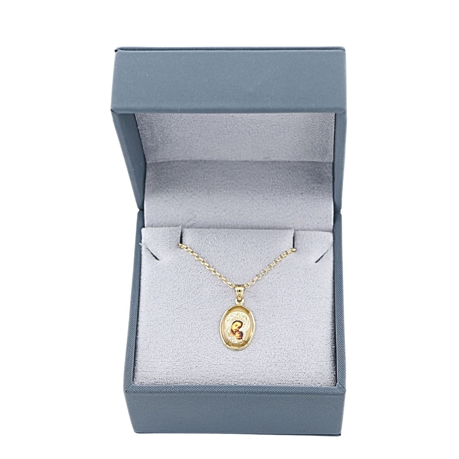 Pandantiv din aur 14k cu icoana color, ovala, simbol al credintei si protectiei divine. Design clasic si elegant, ideal pentru un cadou spiritual de suflet.