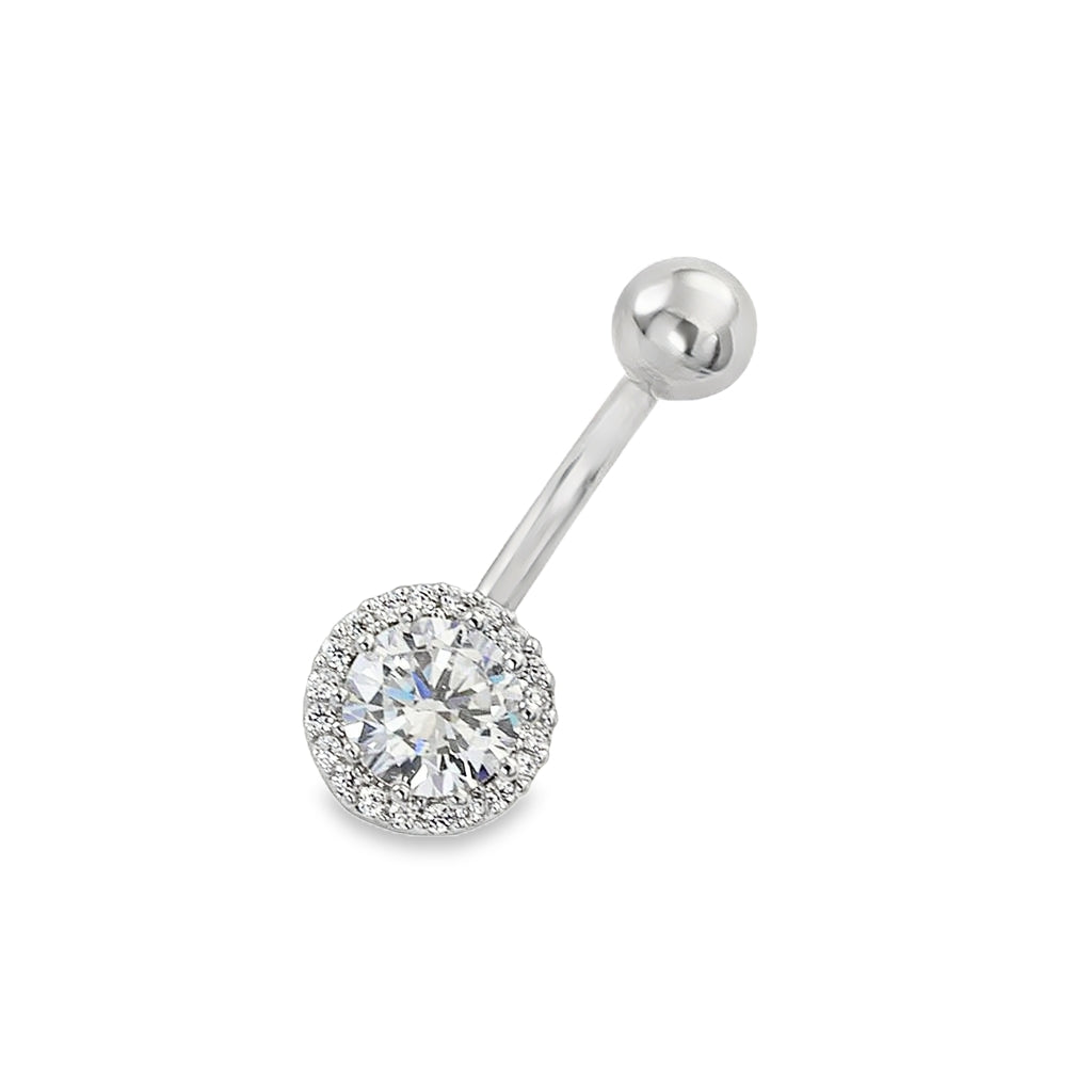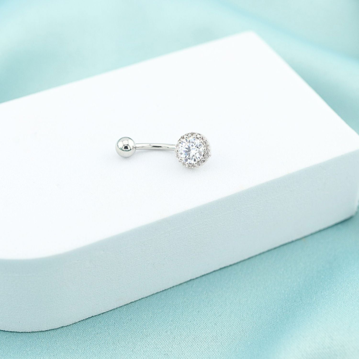 Piercing de buric elegant, din otel chirurgical hipoalergenic, cu pietre albe strălucitoare – accesoriu modern, confortabil și perfect pentru un look feminin și sofisticat.